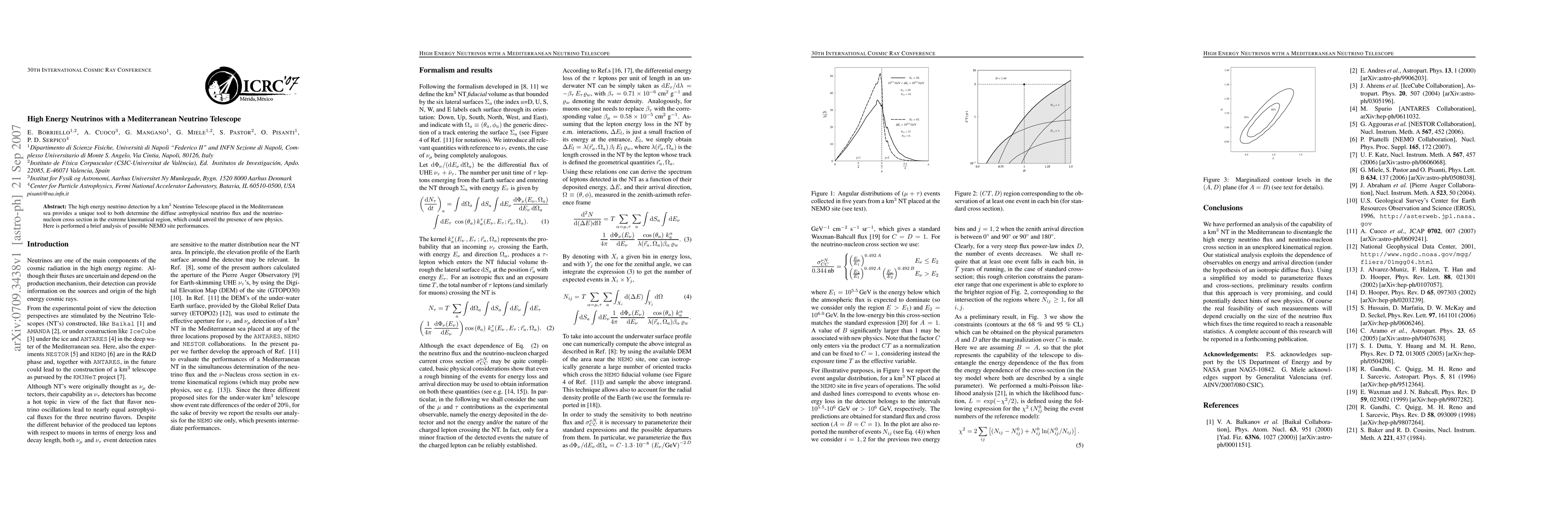 The high energy neutrino detection by a km^3 Neutrino Telescope placed in the Mediterranean sea provides a unique tool to both determine the diffuse astrophysical neutrino flux and the neutrino-nucleon cross section in the extreme kinematical region, which could unveil the presence of new physics. Here is performed a brief analysis of possible NEMO site performances.