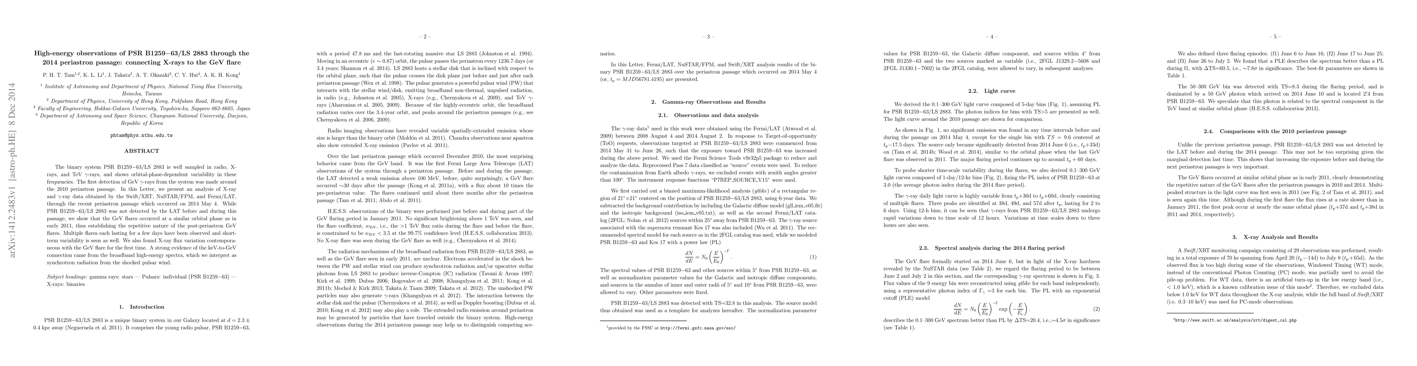 This paper analyzes high-energy observations of the binary system PSR B1259-63/LS 2883 during its 2014 periastron passage, revealing GeV flares at a similar orbital phase to those in 2011. For the first time, it connects X-ray flux variations with the GeV flares, suggesting synchrotron radiation from the shocked pulsar wind as the underlying mechanism.