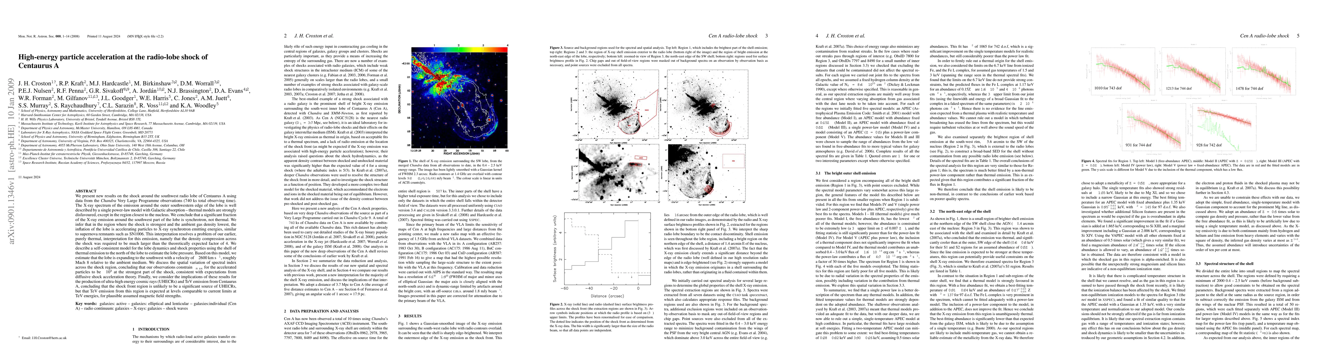 This paper reports on high-energy particle acceleration at the shock of Centaurus A's southwest radio lobe, revealing synchrotron emission rather than thermal, suggesting particle acceleration to X-ray energies via diffusive shock acceleration. The implications suggest TeV emission at current limits but not a significant source of ultra-high energy cosmic rays.