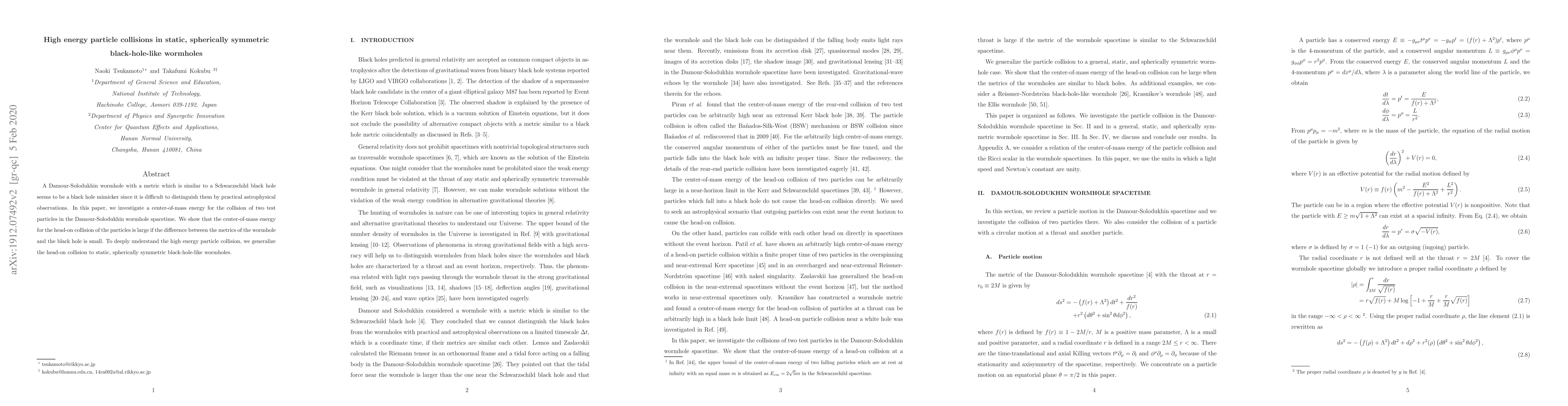 This paper explores high energy particle collisions in Damour-Solodukhin wormholes, which mimic Schwarzschild black holes. It finds that the center-of-mass energy for head-on collisions is significantly high when the wormhole closely resembles a black hole, and generalizes this analysis to broader static, spherically symmetric black-hole-like wormholes.