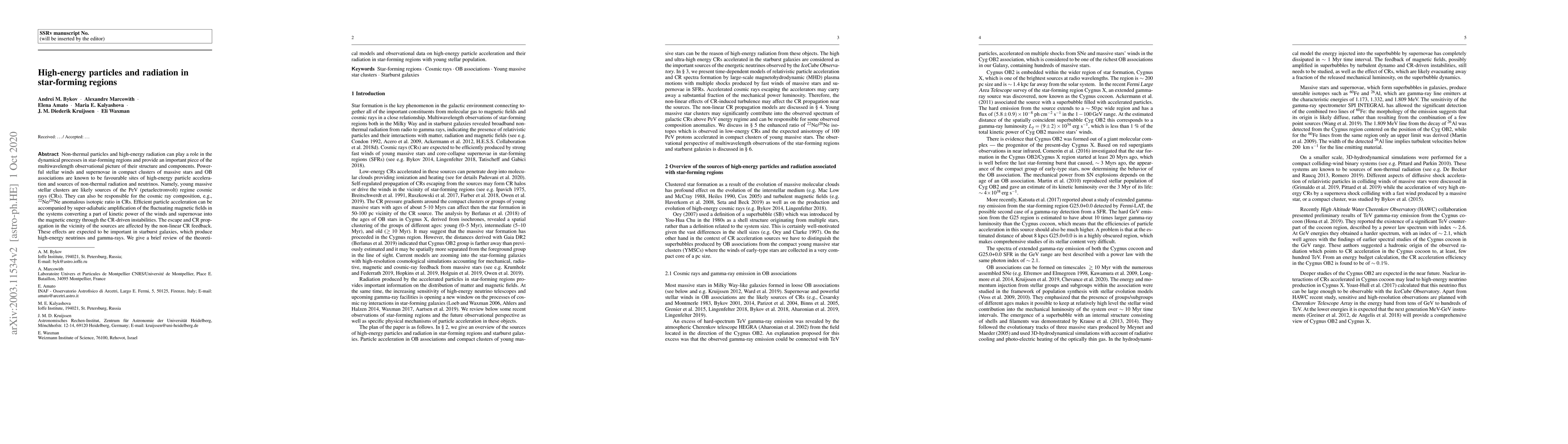 Non-thermal particles and high-energy radiation can play a role in the dynamical processes in star-forming regions and provide an important piece of the multiwavelength observational picture of their structure and components. Powerful stellar winds and supernovae in compact clusters of massive stars and OB associations are known to be favourable sites of high-energy particle acceleration and sources of non-thermal radiation and neutrinos. Namely, young massive stellar clusters are likely sources of the PeV (petaelectronvolt) regime cosmic rays (CRs). They can also be responsible for the cosmic ray composition, e.g., 22Ne/20Ne anomalous isotopic ratio in CRs. Efficient particle acceleration can be accompanied by super-adiabatic amplification of the fluctuating magnetic fields in the systems converting a part of kinetic power of the winds and supernovae into the magnetic energy through the CR-driven instabilities. The escape and CR propagation in the vicinity of the sources are affected by the non-linear CR feedback. These effects are expected to be important in starburst galaxies, which produce high-energy neutrinos and gamma-rays. We give a brief review of the theoretical models and observational data on high-energy particle acceleration and their radiation in star-forming regions with young stellar population.