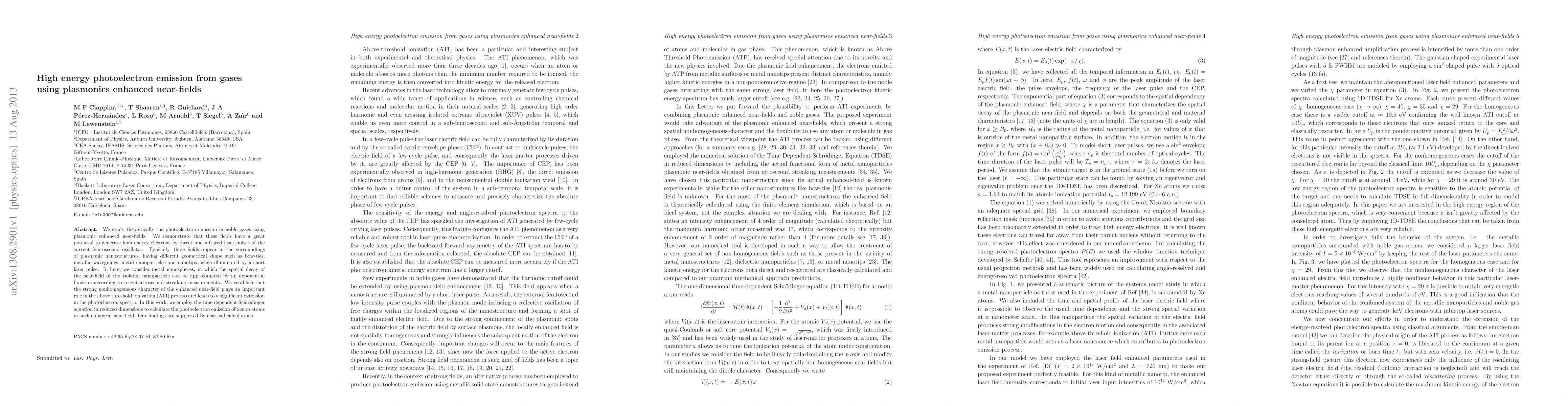 This research theoretically explores high energy photoelectron emission from noble gases using plasmonic enhanced near-fields. The study focuses on metal nanospheres and demonstrates that these near-fields, appearing around plasmonic nanostructures when illuminated by short laser pulses, can generate high energy electrons directly from mid-infrared laser pulses. The results, supported by classical calculations, reveal that the nonhomogeneous character of the enhanced near-field significantly extends photoelectron spectra, offering potential for femtosecond oscillator applications.