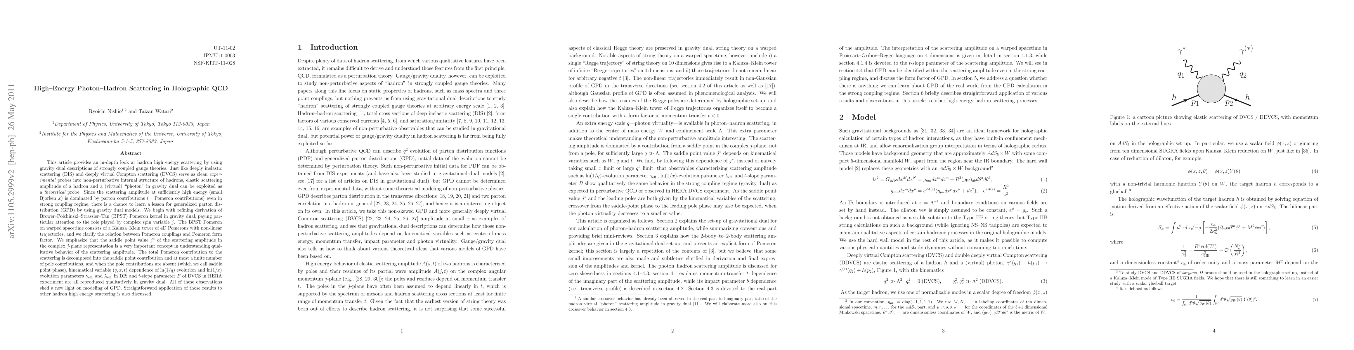 This article provides an in-depth look at hadron high energy scattering by using gravity dual descriptions of strongly coupled gauge theories. Just like deeply inelastic scattering (DIS) and deeply virtual Compton scattering (DVCS) serve as clean experimental probes into non-perturbative internal structure of hadrons, elastic scattering amplitude of a hadron and a (virtual) "photon" in gravity dual can be exploited as a theoretical probe. Since the scattering amplitude at sufficiently high energy (small Bjorken x) is dominated by parton contributions (= Pomeron contributions) even in strong coupling regime, there is a chance to learn a lesson for generalized parton distribution (GPD) by using gravity dual models. We begin with refining derivation of Brower-Polchinski-Strassler-Tan (BPST) Pomeron kernel in gravity dual, paying particular attention to the role played by complex spin variable j. The BPST Pomeron on warped spacetime consists of a Kaluza-Klein tower of 4D Pomerons with non-linear trajectories, and we clarify the relation between Pomeron couplings and Pomeron form factor. We emphasize that the saddle point value j^* of the scattering amplitude in the complex j-plane representation is a very important concept in understanding qualitative behavior of the scattering amplitude. The total Pomeron contribution to the scattering is decomposed into the saddle point contribution and at most a finite number of pole contributions, and when the pole contributions are absent (which we call saddle point phase), kinematical variable (q,x,t) dependence of ln (1/q) evolution and ln(1/x) evolution parameters gamma_eff. and lambda_eff. in DIS and t-slope parameter B of DVCS in HERA experiment are all reproduced qualitatively in gravity dual.