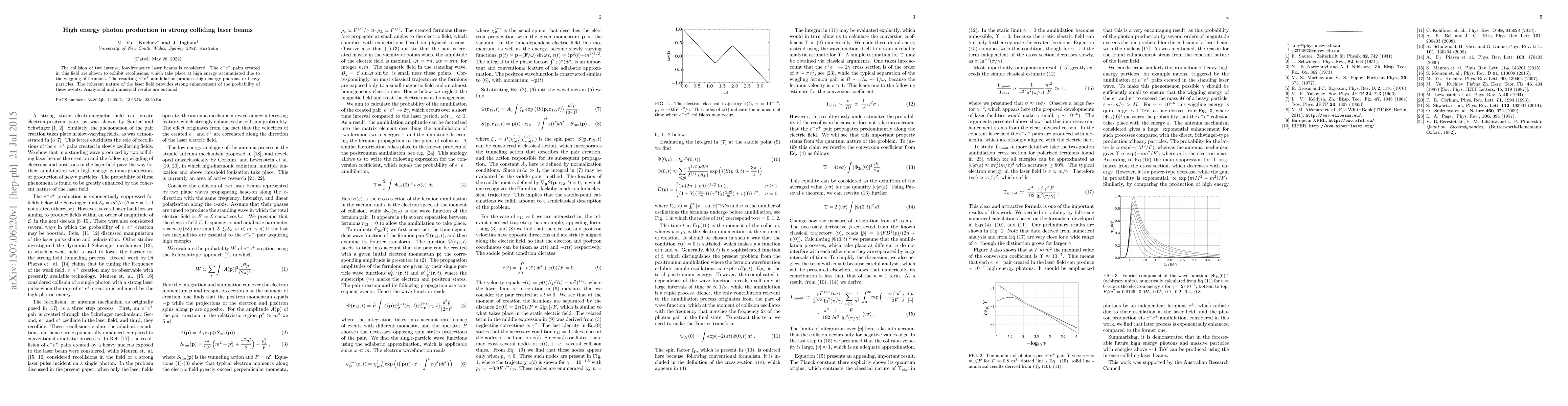 This paper investigates the production of high energy photons through the collision of intense, low-frequency laser beams, where $e^-e^+$ pairs undergo recollisions leading to high energy photon or heavy particle generation due to fermion wiggling. The coherent laser field significantly enhances these events, as demonstrated by analytical and numerical results.