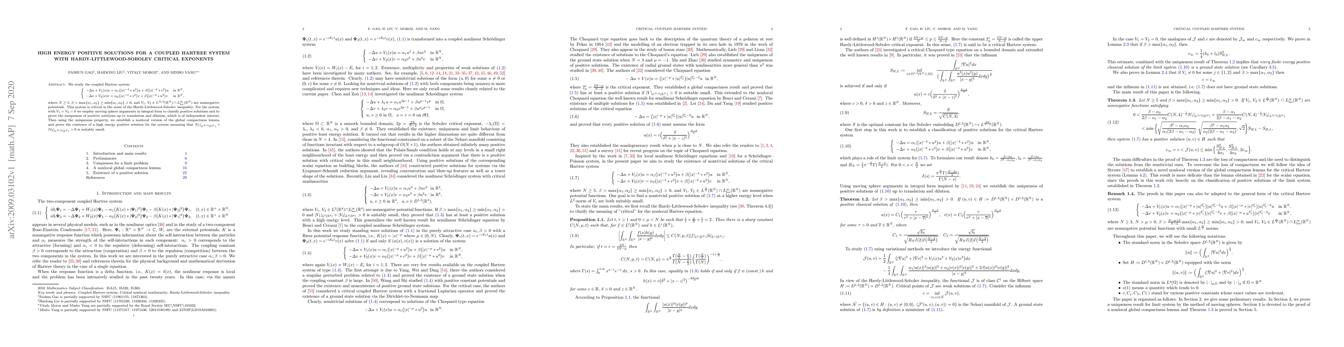 We study the coupled Hartree system $$ \left\{\begin{array}{ll} -\Delta u+ V_1(x)u =\alpha_1\big(|x|^{-4}\ast u^{2}\big)u+\beta \big(|x|^{-4}\ast v^{2}\big)u &\mbox{in}\ \mathbb{R}^N,\\[1mm] -\Delta v+ V_2(x)v =\alpha_2\big(|x|^{-4}\ast v^{2}\big)v +\beta\big(|x|^{-4}\ast u^{2}\big)v &\mbox{in}\ \mathbb{R}^N, \end{array}\right. $$ where $N\geq 5$, $\beta>\max\{\alpha_1,\alpha_2\}\geq\min\{\alpha_1,\alpha_2\}>0$, and $V_1,\,V_2\in L^{N/2}(\mathbb{R}^N)\cap L_{\text{loc}}^{\infty}(\mathbb{R}^N)$ are nonnegative potentials. This system is critical in the sense of the Hardy-Littlewood-Sobolev inequality. For the system with $V_1=V_2=0$ we employ moving sphere arguments in integral form to classify positive solutions and to prove the uniqueness of positive solutions up to translation and dilation, which is of independent interest. Then using the uniqueness property, we establish a nonlocal version of the global compactness lemma and prove the existence of a high energy positive solution for the system assuming that $|V_1|_{L^{N/2}(\mathbb{R}^N)}+|V_2|_{L^{N/2}(\mathbb{R}^N)}>0$ is suitably small.