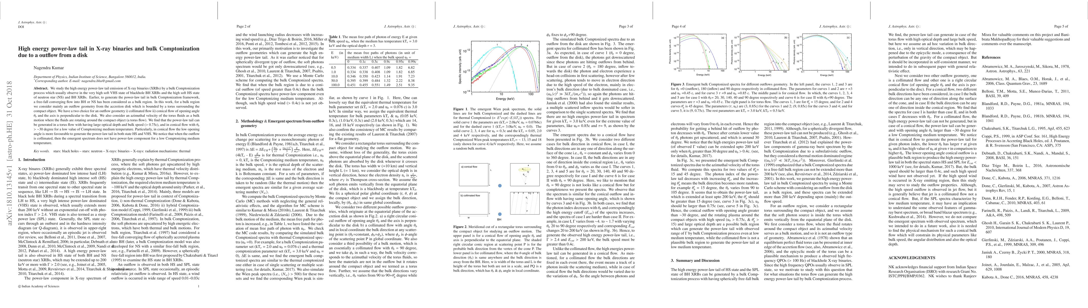 The research explores the high energy power-law tail emission in X-ray binaries via bulk Comptonization, proposing an outflow from the accretion disk as the bulk region, rather than the conventional free-fall flow into a black hole or neutron star. The study reveals that a torus flow with high optical depth and bulk speed, as well as a conical flow with a large opening angle, can generate the power-law tail. Interestingly, collimated outflows do not produce a power-law component for low Comptonizing medium temperatures.