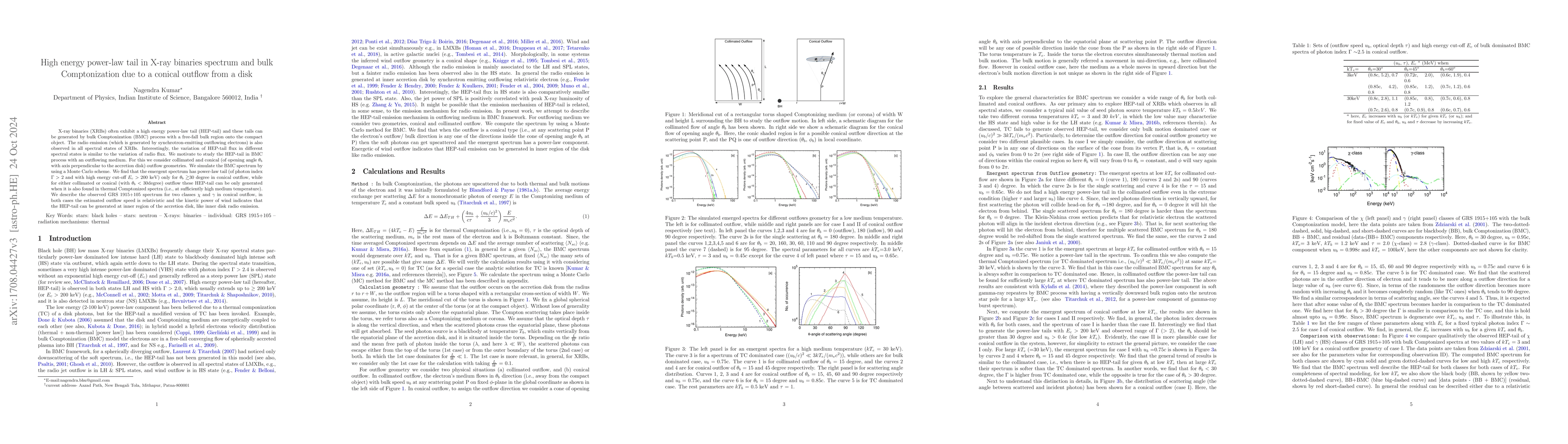 This research investigates the high energy power-law tail in X-ray binaries' spectra through a bulk Comptonization (BMC) process driven by a conical outflow from an accretion disk. Simulations reveal that a power-law tail with a photon index >2 and high energy cut-off >200 keV emerges only for conical outflow angles greater than ~30 degrees. The study also suggests that relativistic, inner-disk winds could explain the spectra of GRS 1915+105, aligning with inner disk radio emission observations.