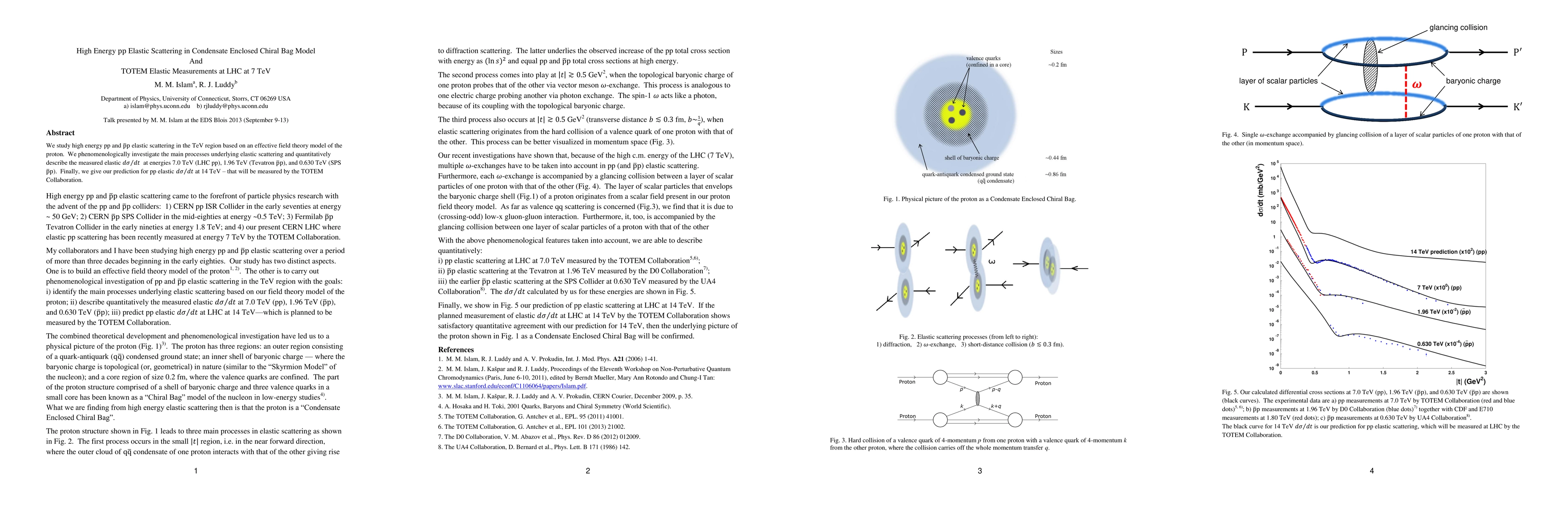 This paper investigates high energy pp and p̄p elastic scattering using an effective field theory model within the condensate enclosed chiral bag model. It analyzes measured elastic differential cross-sections at energies 7.0 TeV, 1.96 TeV, and 0.630 TeV, and predicts the outcome for 14 TeV pp collisions to be measured by the TOTEM Collaboration at the LHC.