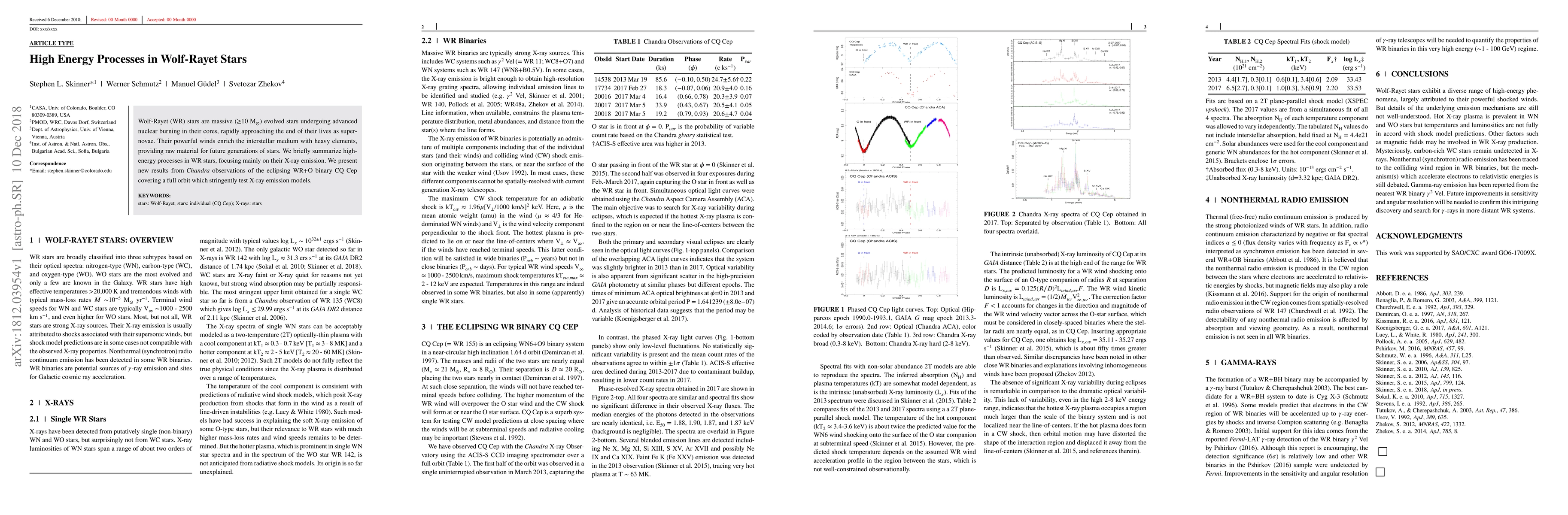 Wolf-Rayet (WR) stars are massive ($\geq$10 M$_{\odot}$) evolved stars undergoing advanced nuclear burning in their cores, rapidly approaching the end of their lives as supernovae. Their powerful winds enrich the interstellar medium with heavy elements, providing raw material for future generations of stars. We briefly summarize high-energy processes in WR stars, focusing mainly on their X-ray emission. We present new results from Chandra observations of the eclipsing WR+O binary CQ Cep covering a full orbit which stringently test X-ray emission models.