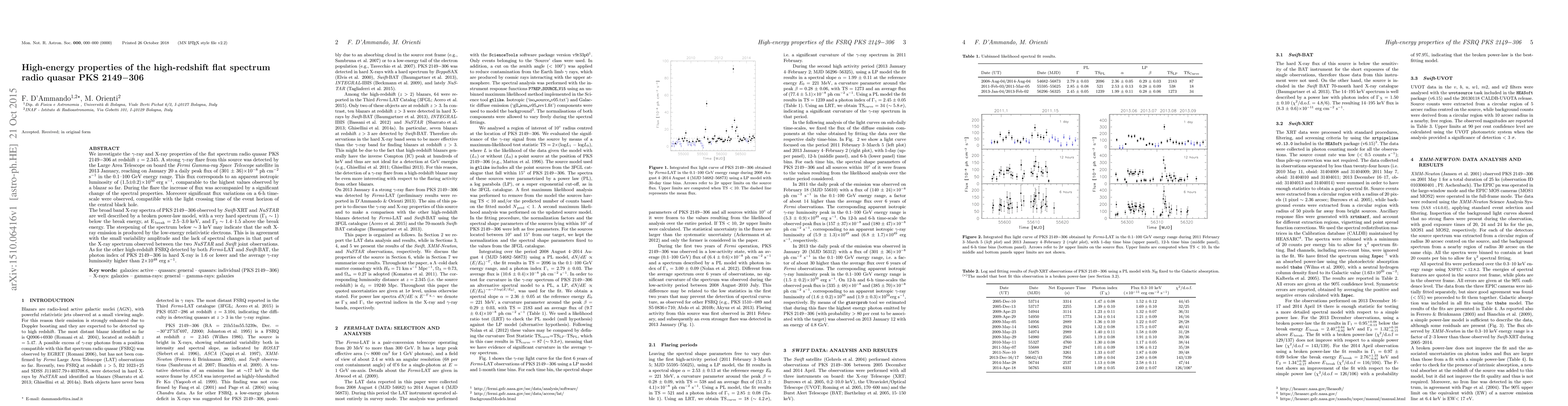 The study investigates the gamma-ray and X-ray properties of the high-redshift flat spectrum radio quasar PKS 2149-306, noting a significant gamma-ray flare in 2013, which displayed rapid flux variations and spectral changes, suggesting emission from the vicinity of the central black hole. The X-ray spectra fit a broken power-law model, indicating the soft X-ray emission likely originates from low-energy relativistic electrons.