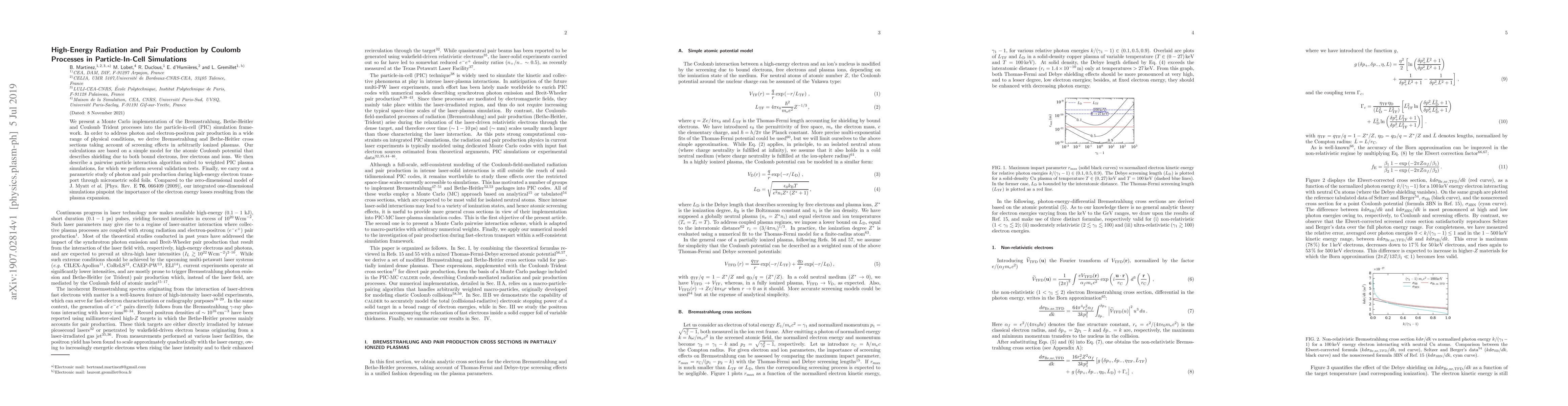 We present a Monte Carlo implementation of the Bremsstrahlung, Bethe-Heitler and Coulomb Trident processes into the particle-in-cell (PIC) simulation framework. In order to address photon and electron-positron pair production in a wide range of physical conditions, we derive Bremsstrahlung and Bethe-Heitler cross sections taking account of screening effects in arbitrarily ionized plasmas. Our calculations are based on a simple model for the atomic Coulomb potential that describes shielding due to both bound electrons, free electrons and ions. We then describe a pairwise particle interaction algorithm suited to weighted PIC plasma simulations, for which we perform several validation tests. Finally, we carry out a parametric study of photon and pair production during high-energy electron transport through micrometric solid foils. Compared to the zero-dimensional model of J. Myatt et al. [Phys. Rev. E 76, 066409 (2009)], our integrated one-dimensional simulations pinpoint the importance of the electron energy losses resulting from the plasma expansion.
