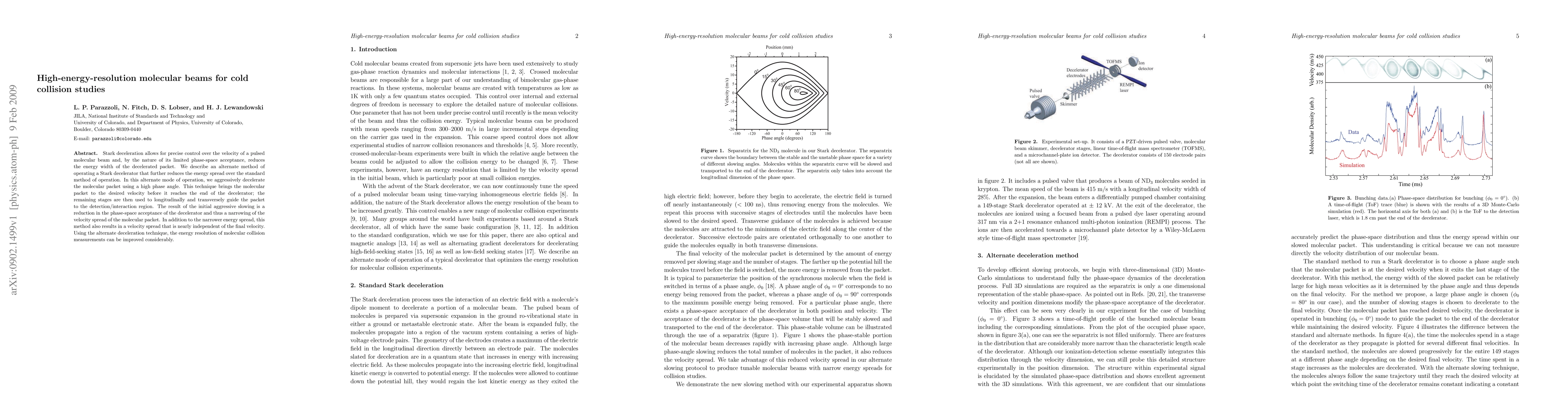 Stark deceleration allows for precise control over the velocity of a pulsed molecular beam and, by the nature of its limited phase-space acceptance, reduces the energy width of the decelerated packet. We describe an alternate method of operating a Stark decelerator that further reduces the energy spread over the standard method of operation. In this alternate mode of operation, we aggressively decelerate the molecular packet using a high phase angle. This technique brings the molecular packet to the desired velocity before it reaches the end of the decelerator; the remaining stages are then used to longitudinally and transversely guide the packet to the detection/interaction region. The result of the initial aggressive slowing is a reduction in the phase-space acceptance of the decelerator and thus a narrowing of the velocity spread of the molecular packet. In addition to the narrower energy spread, this method also results in a velocity spread that is nearly independent of the final velocity. Using the alternate deceleration technique, the energy resolution of molecular collision measurements can be improved considerably.