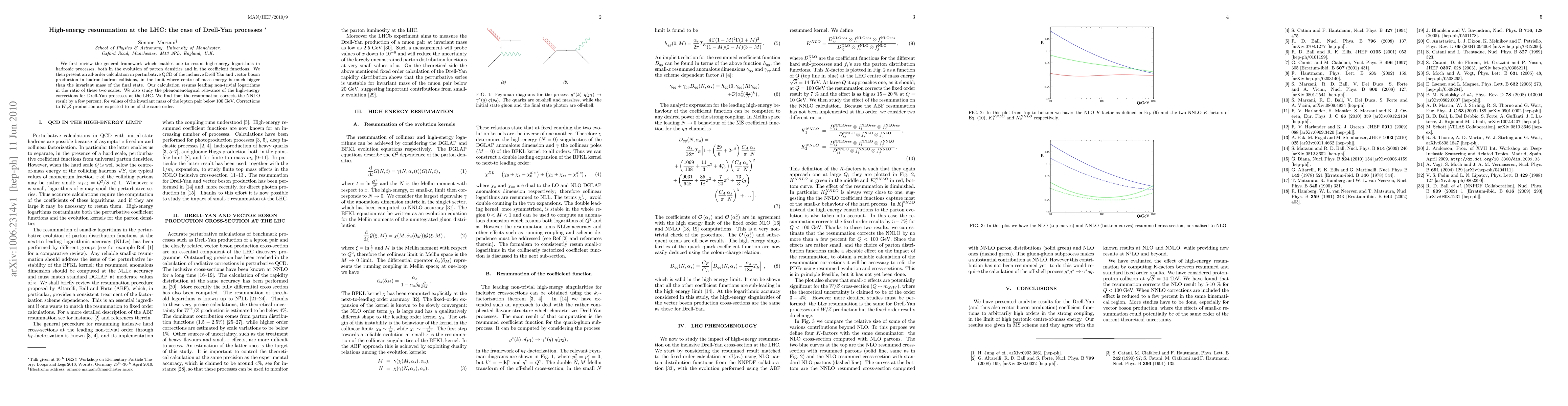 This paper details a method to resum high-energy logarithms in hadronic processes, applying it to Drell-Yan production at the LHC. The resummation corrects NNLO results by a few percent for lepton pair invariant masses below 100 GeV, with similar corrections expected for W and Z production.