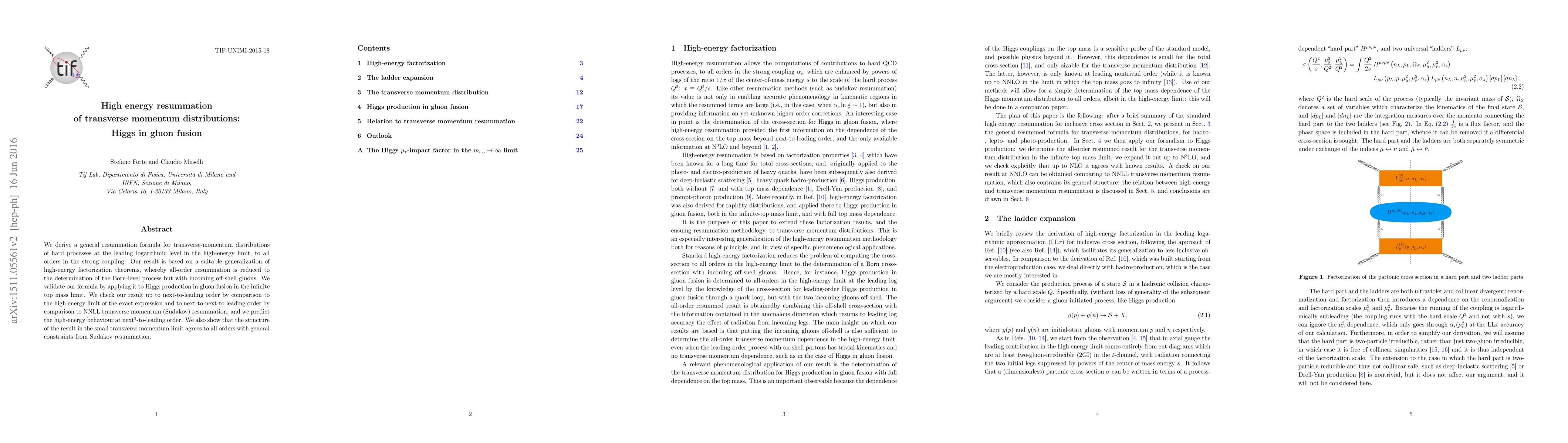 This paper presents a general resummation formula for transverse momentum distributions in high-energy processes, validated through its application to Higgs production in gluon fusion. The formula is derived using high-energy factorization theorems, and it is shown to agree with exact and higher-order resummation results.
