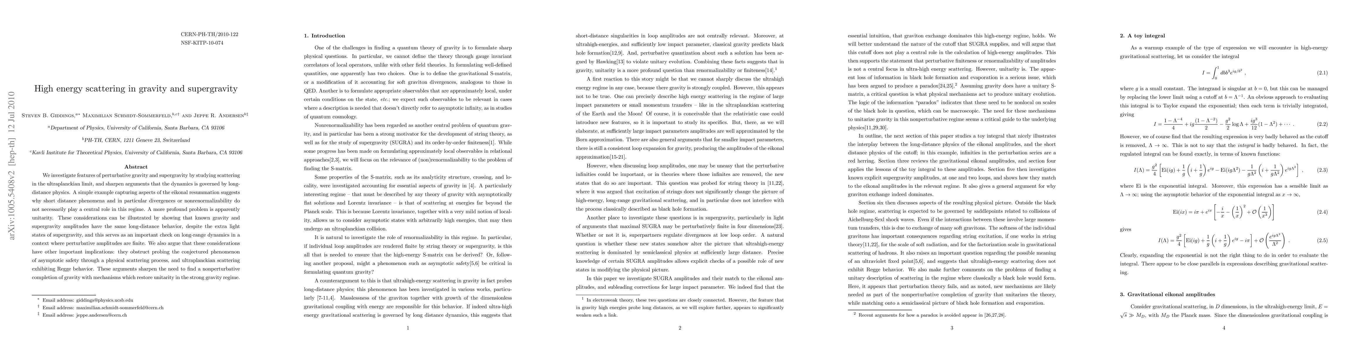 We investigate features of perturbative gravity and supergravity by studying scattering in the ultraplanckian limit, and sharpen arguments that the dynamics is governed by long-distance physics. A simple example capturing aspects of the eikonal resummation suggests why short distance phenomena and in particular divergences or nonrenormalizability do not necessarily play a central role in this regime. A more profound problem is apparently unitarity. These considerations can be illustrated by showing that known gravity and supergravity amplitudes have the same long-distance behavior, despite the extra light states of supergravity, and this serves as an important check on long-range dynamics in a context where perturbative amplitudes are finite. We also argue that these considerations have other important implications: they obstruct probing the conjectured phenomenon of asymptotic safety through a physical scattering process, and ultraplanckian scattering exhibiting Regge behavior. These arguments sharpen the need to find a nonperturbative completion of gravity with mechanisms which restore unitarity in the strong gravity regime.
