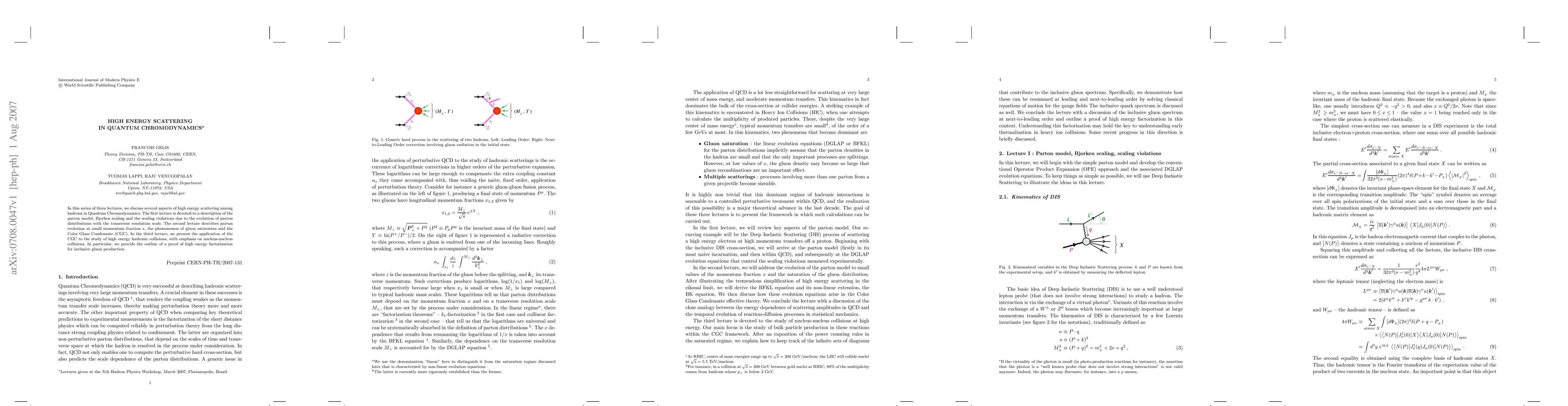 This research series explores high energy scattering in Quantum Chromodynamics (QCD), covering the parton model, Bjorken scaling, gluon saturation, and the Color Glass Condensate (CGC), culminating in a proof of high energy factorization for inclusive gluon production in nucleus-nucleus collisions.