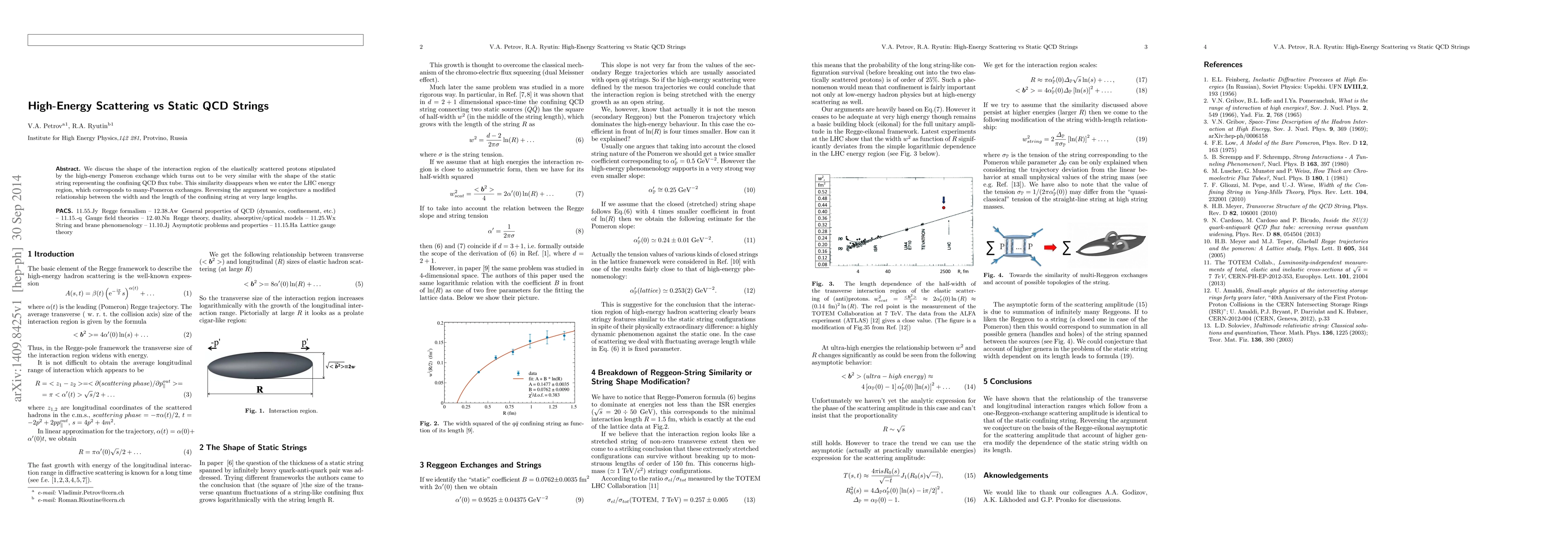 The paper explores similarities between high-energy proton scattering via Pomeron exchange and static QCD strings, suggesting a correspondence in their shapes. However, this resemblance fades at LHC energies due to multiple Pomeron exchanges, prompting a conjecture on modified string properties at vast lengths.