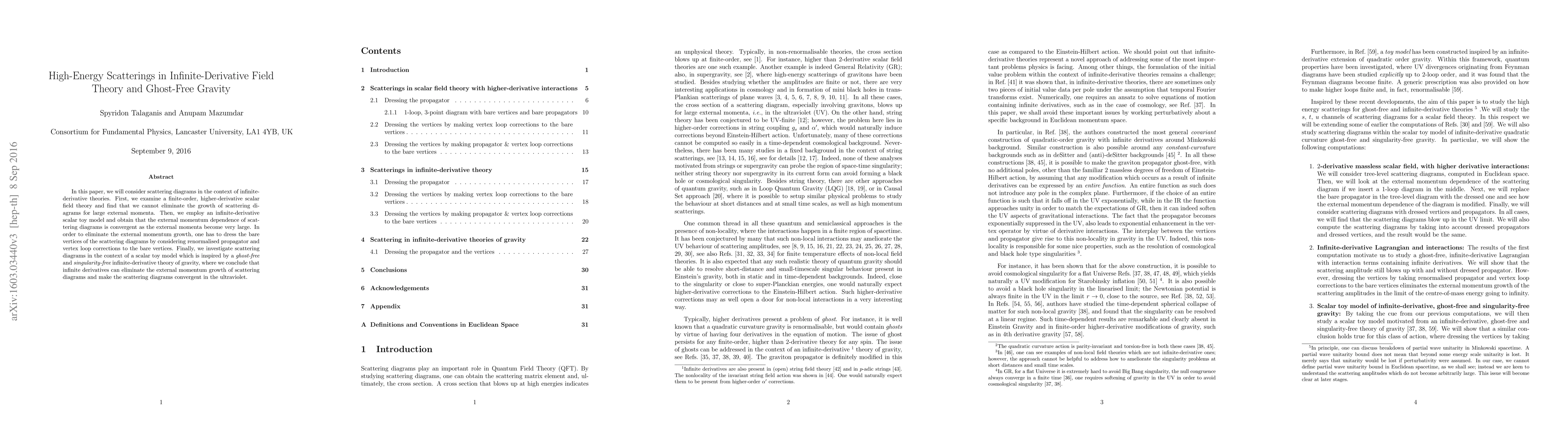 This paper explores high-energy scatterings in infinite-derivative field theories, finding that while finite-order higher-derivative scalar field theories exhibit divergences, infinite-derivative models can render scattering diagrams convergent. It concludes that renormalised corrections are necessary to eliminate divergences in finite-order theories.