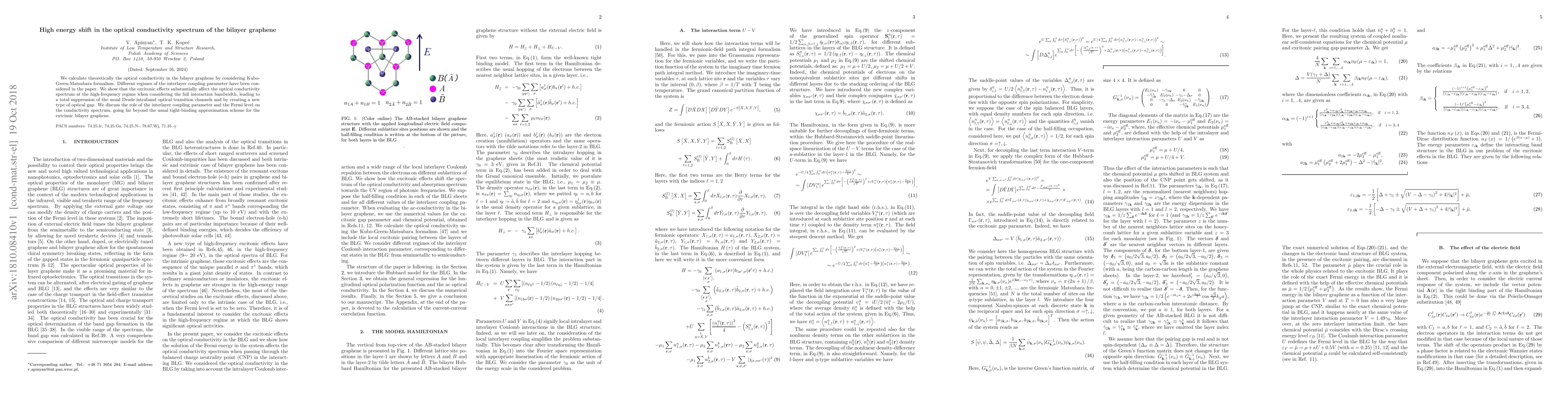 This paper theoretically investigates the optical conductivity of bilayer graphene using the Kubo-Green-Matsubara formalism. It reveals that excitonic effects significantly alter the high-frequency optical conductivity spectrum, suppressing intraband transitions and generating a new optical gap, with the interlayer coupling and Fermi level playing crucial roles.