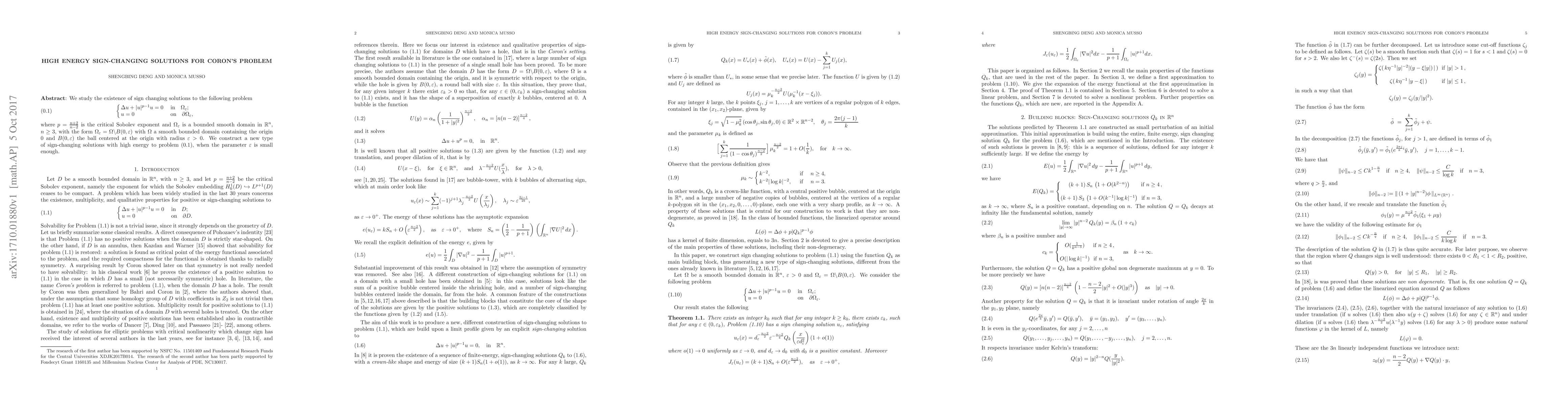 Researchers found a new type of sign-changing solutions with high energy to Coron's problem, which solves the equation for p = (n+2)/(n-2) when epsilon is small enough.