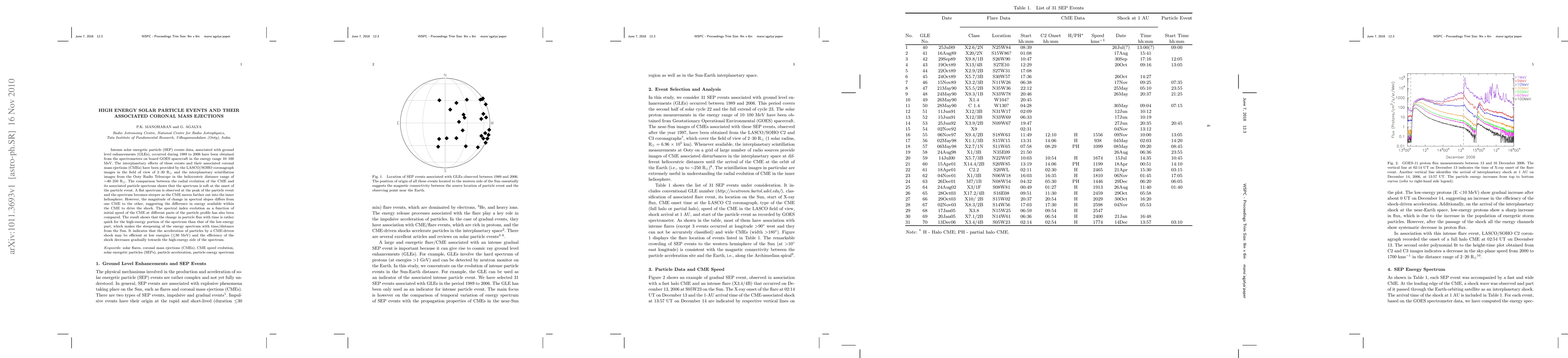 This study analyzes high-energy solar particle events (SEPs) and their associated coronal mass ejections (CMEs) from 1989 to 2006, revealing that particle spectra are initially soft, flatten at peak intensity, and steepen as CMEs propagate outward. The efficiency of particle acceleration by CME-driven shocks is higher at lower energies, decreasing for higher energies.