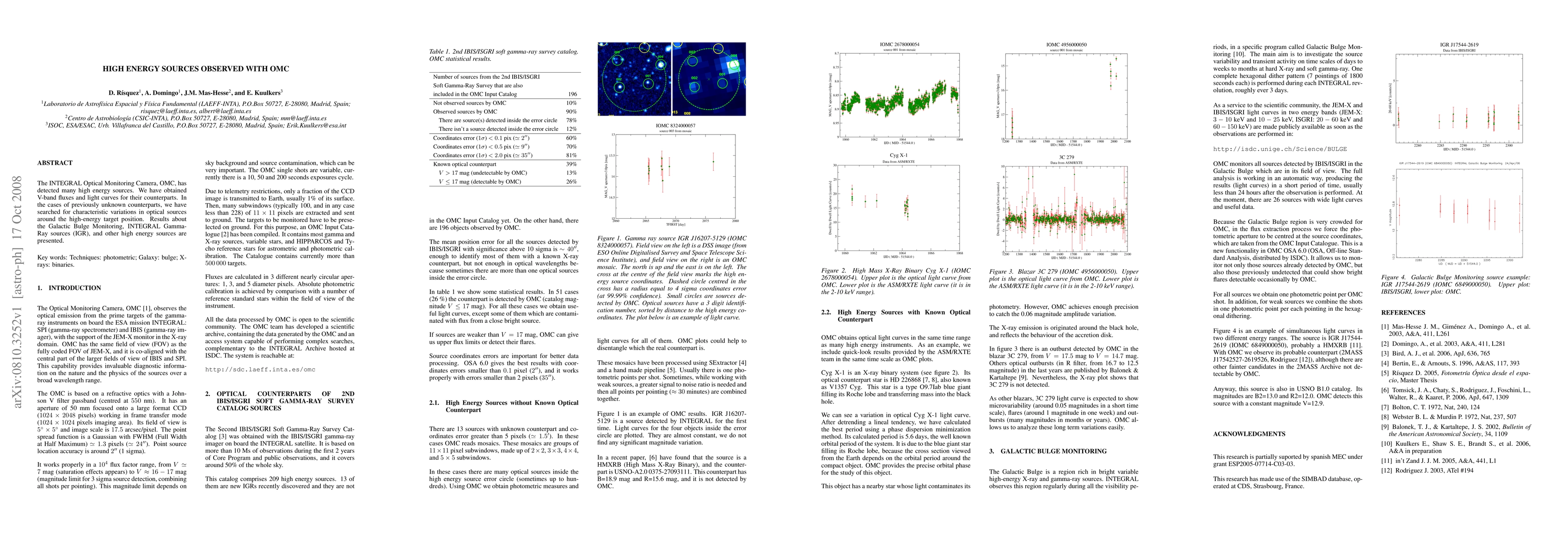 The study utilizes the INTEGRAL Optical Monitoring Camera (OMC) to detect high energy sources, measuring V-band fluxes and light curves for their counterparts. It reports findings on Galactic Bulge Monitoring, INTEGRAL Gamma-Ray sources (IGR), and other high energy sources, identifying new optical counterparts and analyzing their variations.