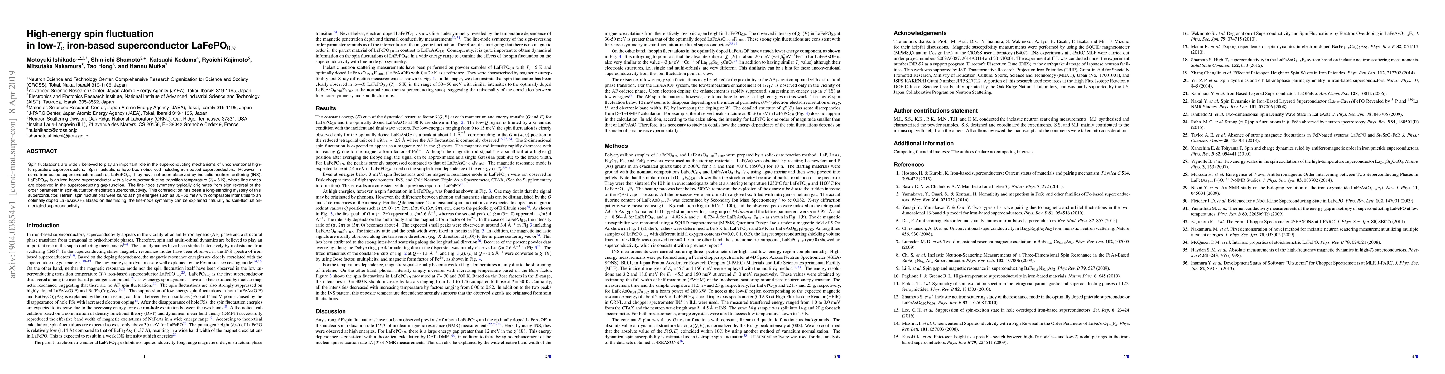 This paper reveals high-energy spin fluctuations in the low-$T_{\rm c}$ iron-based superconductor LaFePO$_{0.9}$, resolving the mystery of its line-node symmetry and supporting the role of spin fluctuations in its superconductivity. The findings suggest comparable spin-fluctuation intensities to those in optimally doped LaFeAs(O,F).