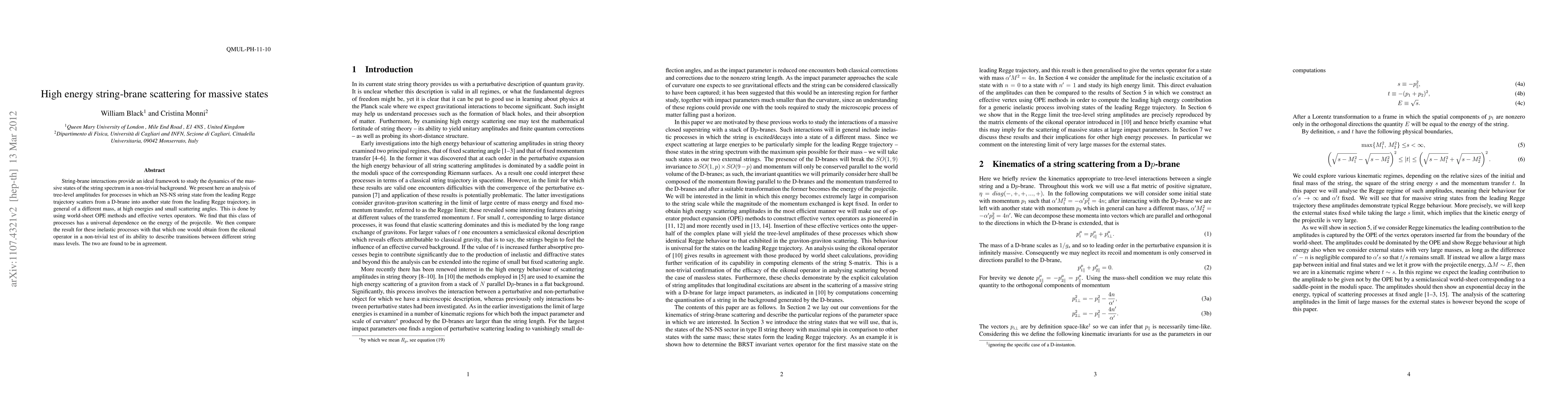 This study provides insights into the dynamics of massive string states in non-trivial backgrounds, contributing to our understanding of string-brane interactions at high energies and small scattering angles, which is crucial for string phenomenology and the AdS/CFT correspondence.