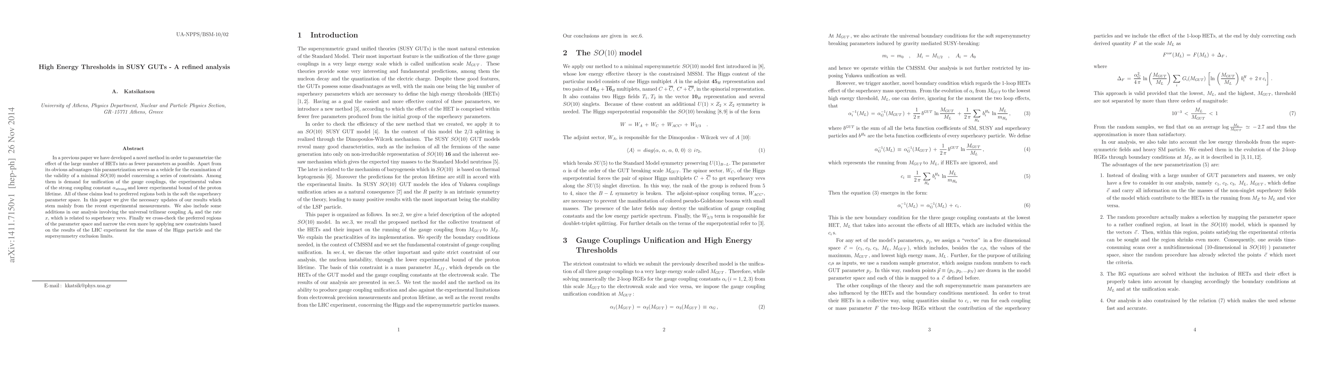In a previous paper we have developed a novel method in order to parametrize the effect of the large number of HETs into as fewer parameters as possible. Apart from its obvious advantages this parametrization serves as a vehicle for the examination of the validity of a minimal SO(10) model concerning a series of constraints. Among them is demand for unification of the gauge couplings, the experimental values of the strong coupling constant and lower experimental bound of the proton lifetime. All of these claims lead to preferred regions both in the soft the superheavy parameter space. In this paper we give the necessary updates of our results which stem mainly from the recent experimental measurements. We also include some additions in our analysis involving the universal trilinear coupling A_0 and the rate x, which is related to superheavy vevs. Finally we cross-check the preferred regions of the parameter space and narrow the even more by applying new constraints based on the results of the LHC experiment for the mass of the Higgs particle and the supersymmetry exclusion limits.