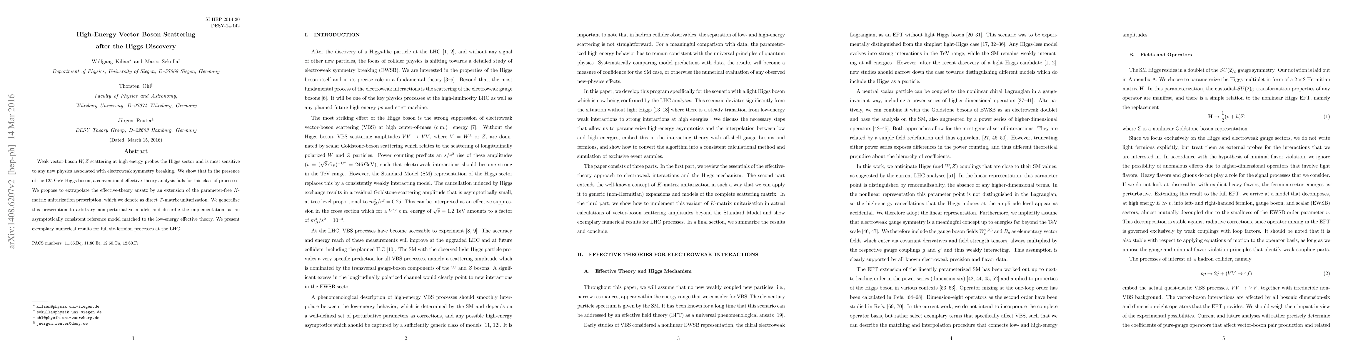 This paper investigates high-energy vector boson scattering, emphasizing the limitations of conventional effective-theory analysis in the presence of the 125 GeV Higgs boson. It proposes a new direct T-matrix unitarization method to extend the effective-theory ansatz, presenting numerical results for six-fermion processes at the LHC.