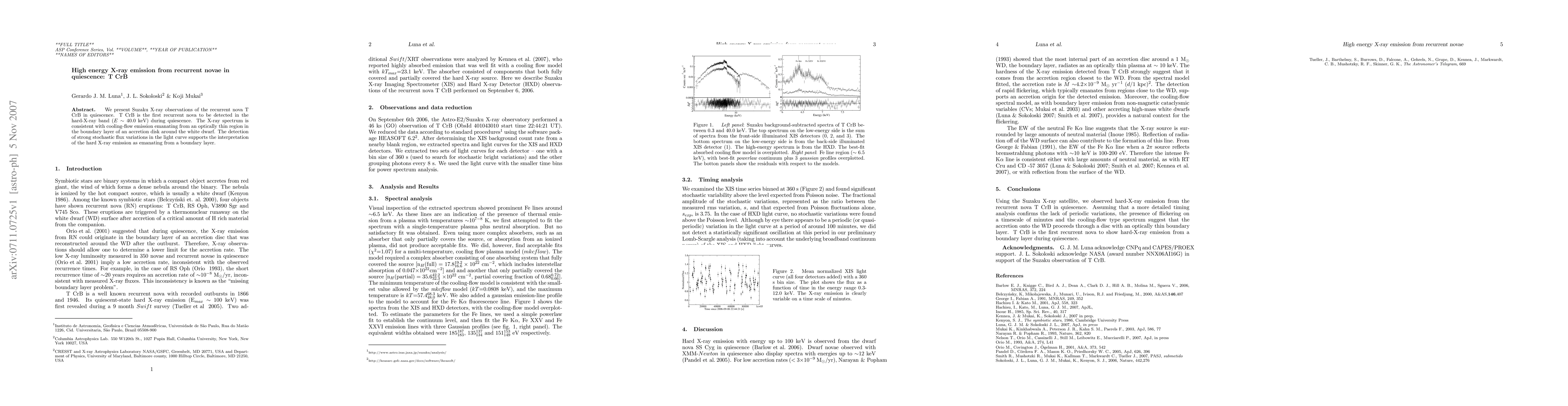 We present Suzaku X-ray observations of the recurrent nova T CrB in quiescence. T CrB is the first recurrent nova to be detected in the hard-X-ray band (E ~ 40.0 keV) during quiescence. The X-ray spectrum is consistent with cooling-flow emission emanating from an optically thin region in the boundary layer of an accretion disk around the white dwarf. The detection of strong stochastic flux variations in the light curve supports the interpretation of the hard X-ray emission as emanating from a boundary layer.