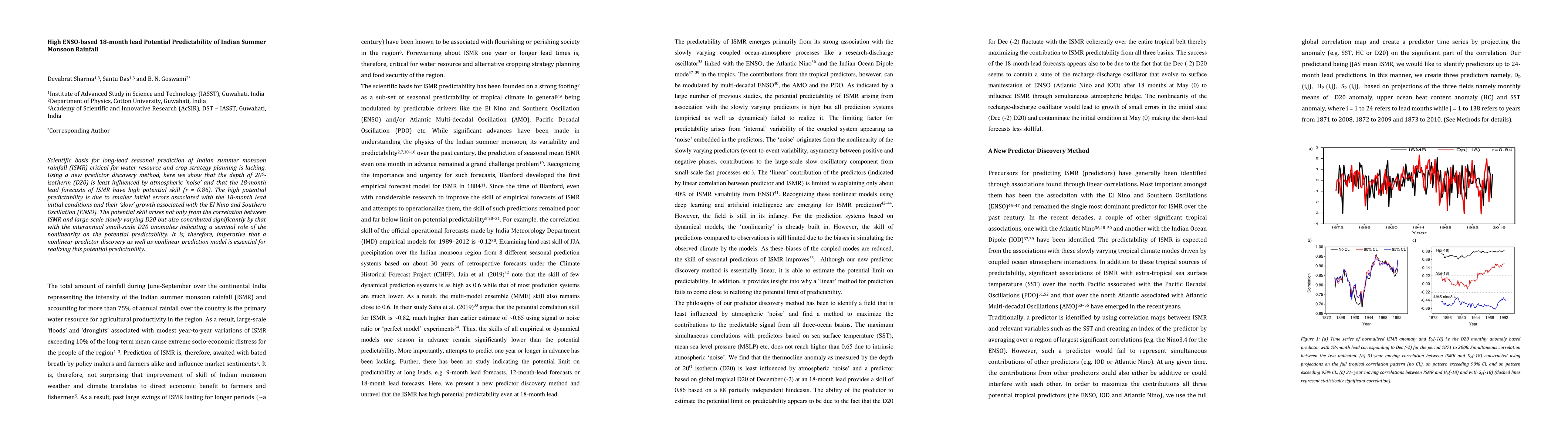 This research identifies a new method using the depth of the 20-degree isotherm (D20) as a predictor for Indian Summer Monsoon Rainfall (ISMR) 18 months in advance with high potential skill (r = 0.86). The predictability stems from ENSO influence and both large-scale and small-scale D20 anomalies, emphasizing the role of nonlinearity in prediction models for effective water resource and crop planning.
