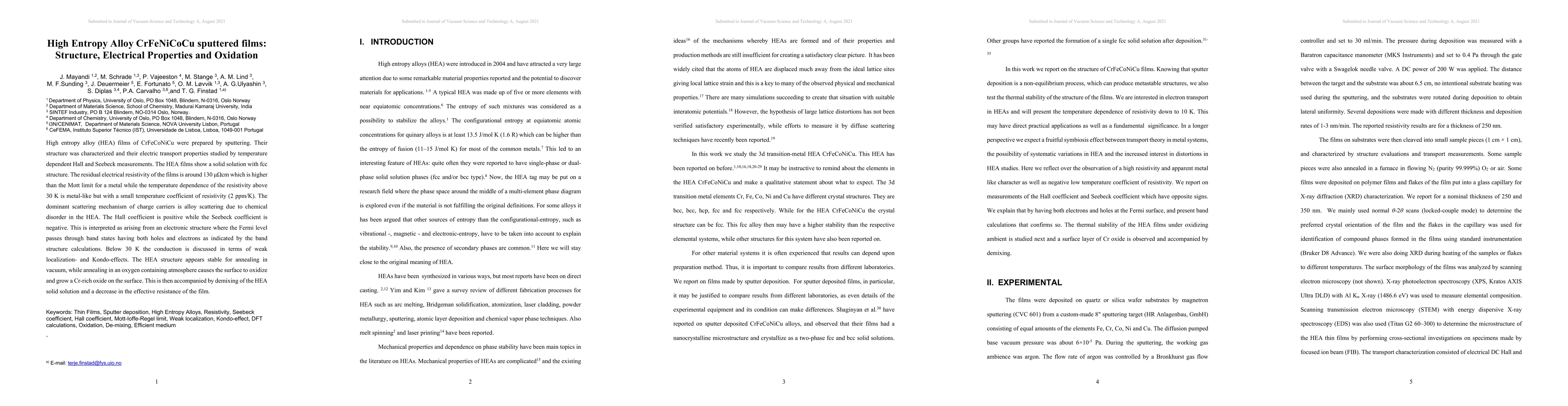 High entropy alloy (HEA) films of CrFeNiCoCu were sputtered and characterized, showing a stable fcc structure with a small temperature coefficient of resistivity. The films exhibit a metal-like resistivity and a unique electronic structure with both hole and electron band states.