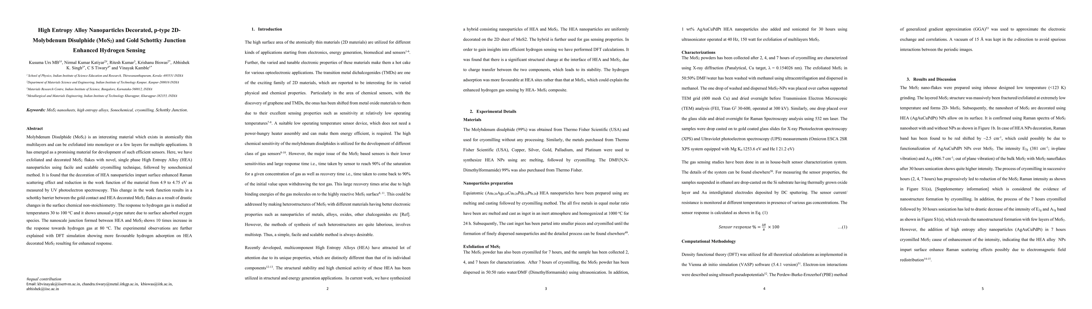 This paper reports the development of a hydrogen sensor using p-type 2D MoS2 decorated with High Entropy Alloy nanoparticles, showing a 10-fold increase in hydrogen sensing response at 80°C due to the formation of a Schottky junction and surface-enhanced effects. DFT simulations support the enhanced hydrogen adsorption facilitated by the alloy nanoparticles.