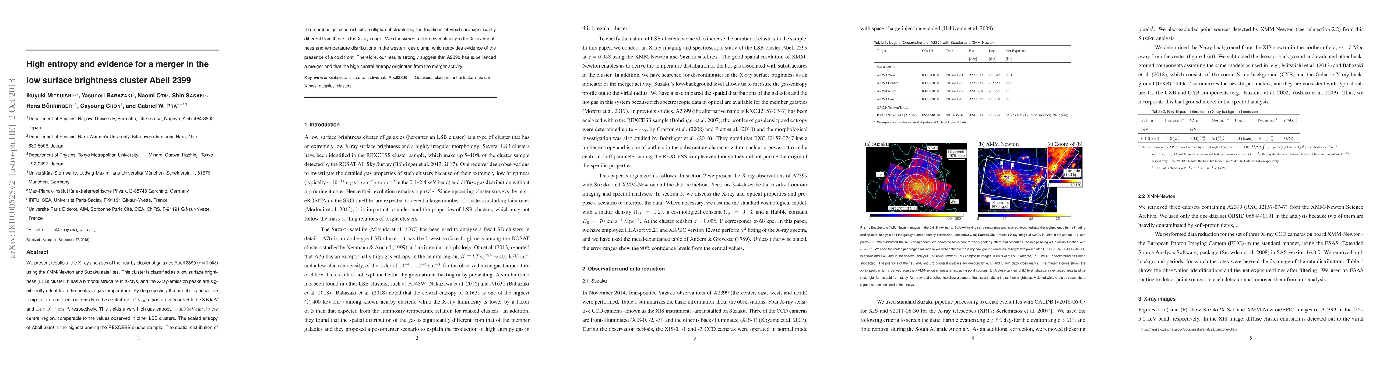 This paper reports high entropy and evidence of a merger in the low surface brightness cluster Abell 2399, observed via XMM-Newton and Suzaku satellites. The cluster shows a bimodal X-ray structure with significant offsets in emission peaks and gas temperature, indicating a cold front and suggesting merger activity.