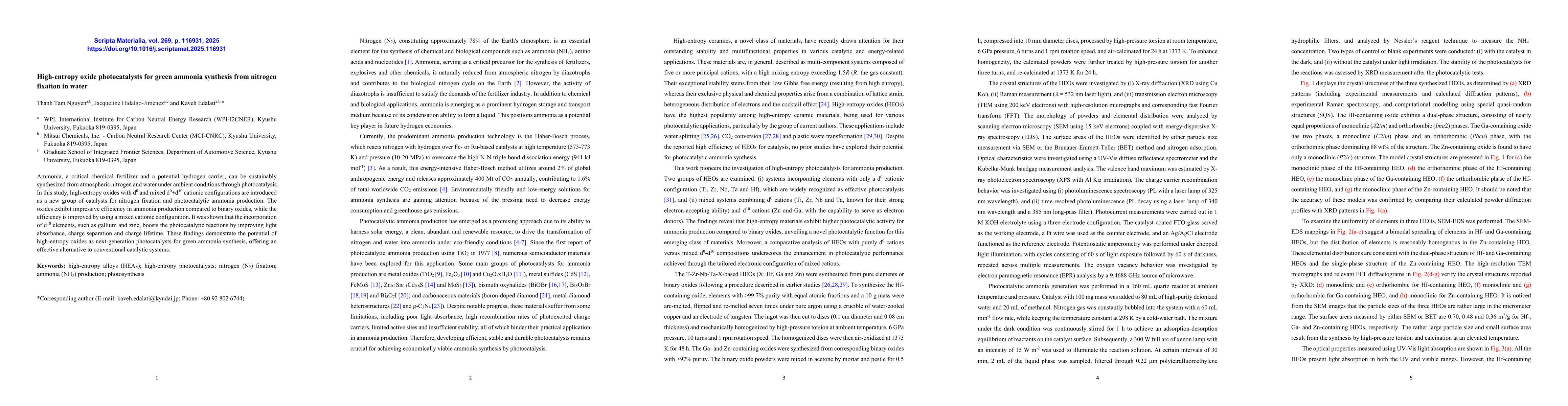 Ammonia, a critical chemical fertilizer and a potential hydrogen carrier, can be sustainably synthesized from atmospheric nitrogen and water under ambient conditions through photocatalysis. In this study, high-entropy oxides with d0 and mixed d0+d10 cationic configurations are introduced as a new group of catalysts for nitrogen fixation and photocatalytic ammonia production. The oxides exhibit impressive efficiency in ammonia production compared to binary oxides, while the efficiency is improved by using a mixed cationic configuration. It was shown that the incorporation of d10 elements, such as gallium and zinc, boosts the photocatalytic reactions by improving light absorbance, charge separation and charge lifetime. These findings demonstrate the potential of high-entropy oxides as next-generation photocatalysts for green ammonia synthesis, offering an effective alternative to conventional catalytic systems.