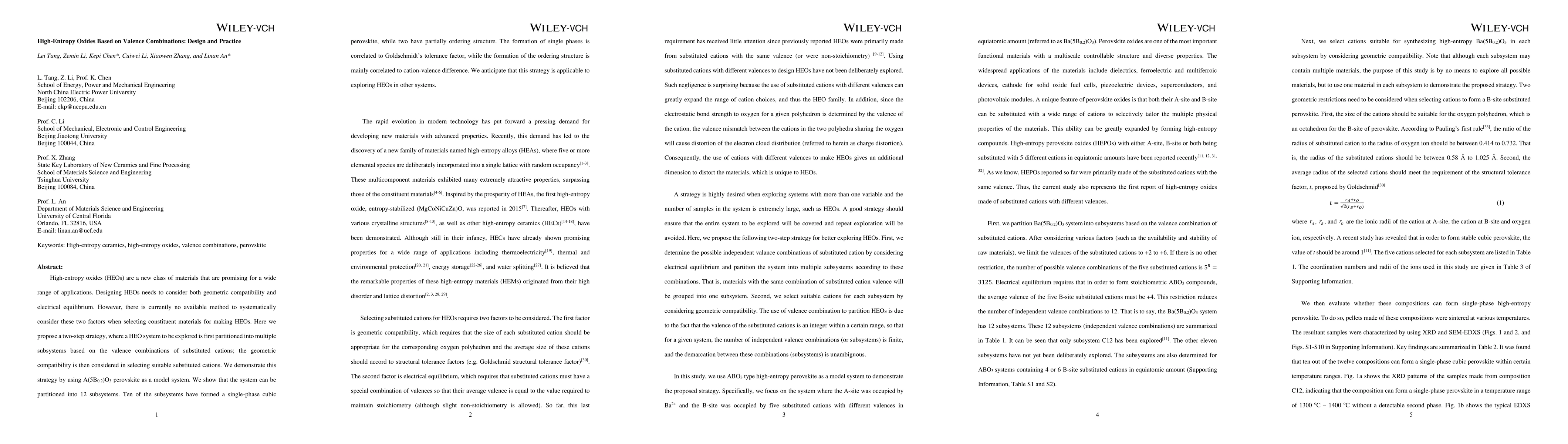 High-entropy oxides (HEOs) are a new class of materials that are promising for a wide range of applications. Designing HEOs needs to consider both geometric compatibility and electrical equilibrium. However, there is currently no available method to systematically consider these two factors when selecting constituent materials for making HEOs. Here we propose a two-step strategy, where a HEO system to be explored is first partitioned into multiple subsystems based on the valence combinations of substituted cations; the geometric compatibility is then considered in selecting suitable substituted cations. We demonstrate this strategy by using A(5B0.2)O3 perovskite as a model system. We show that the system can be partitioned into 12 subsystems. Ten of the subsystems have formed a single-phase cubic perovskite, while two have partially ordering structure. The formation of single phases is correlated to Goldschmidt's tolerance factor, while the formation of the ordering structure is mainly correlated to cation-valence difference. We anticipate that this strategy is applicable to exploring HEOs in other systems.