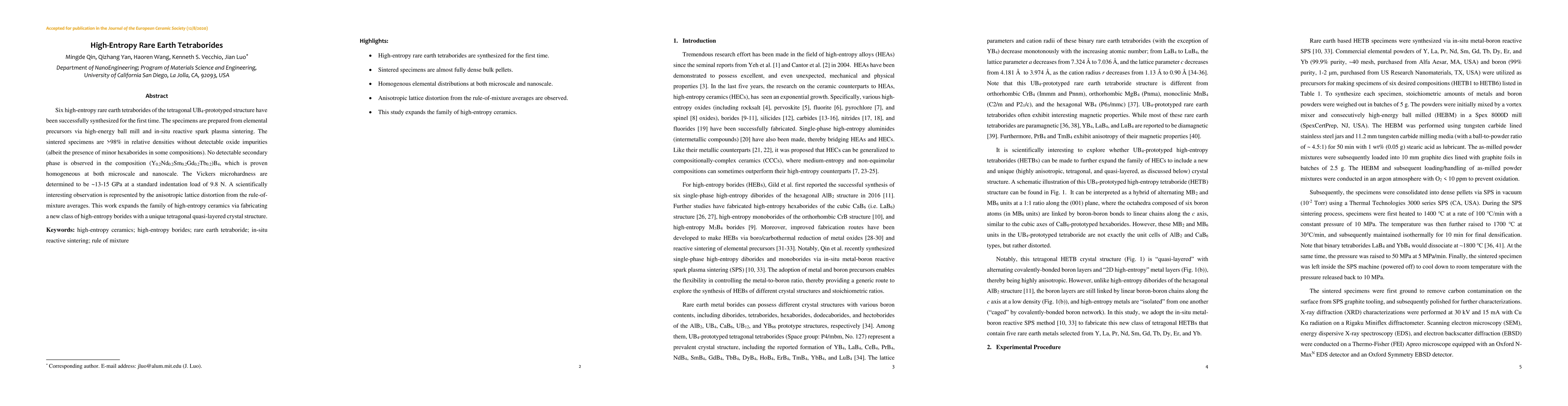 This paper reports the synthesis of six high-entropy rare earth tetraborides with a tetragonal UB4 structure, achieving high relative densities and minimal impurities. The Vickers microhardness ranges from 13-15 GPa, and an intriguing anisotropic lattice distortion is observed, expanding the scope of high-entropy ceramics.