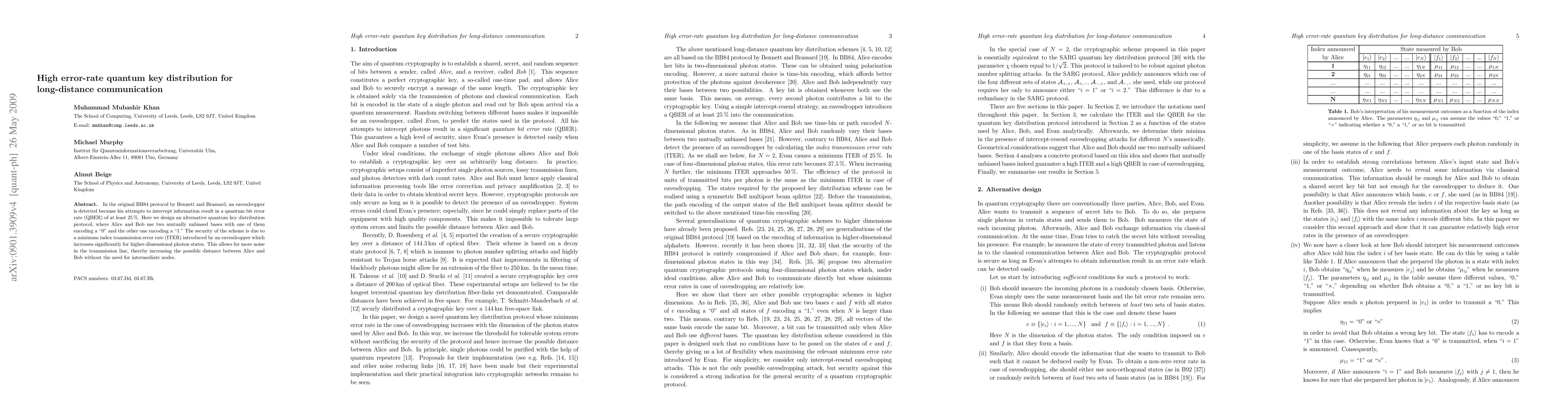 In the original BB84 protocol by Bennett and Brassard, an eavesdropper is detected because his attempts to intercept information result in a quantum bit error rate (QBER) of at least 25%. Here we design an alternative quantum key distribution protocol, where Alice and Bob use two mutually unbiased bases with one of them encoding a "0" and the other one encoding a "1." The security of the scheme is due to a minimum index transmission error rate (ITER) introduced by an eavesdropper which increases significantly for higher-dimensional photon states. This allows for more noise in the transmission line, thereby increasing the possible distance between Alice and Bob without the need for intermediate nodes.
