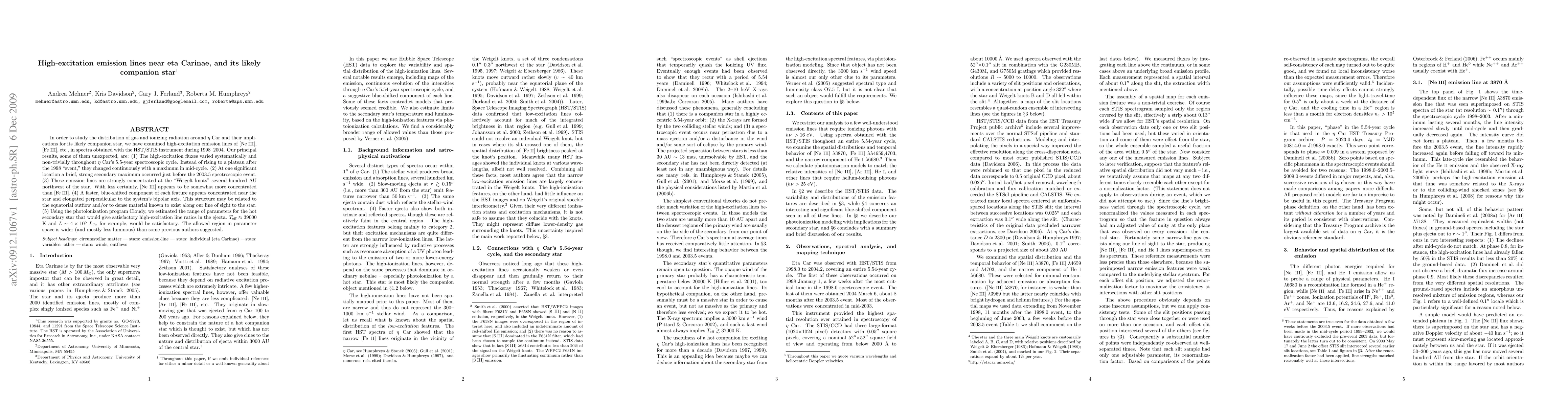 In order to study the distribution of gas and ionizing radiation around eta Car and their implications for its likely companion star, we have examined high-excitation emission lines of [Ne III], [Fe III], etc., in spectra obtained with the HST/STIS instrument during 1998-2004. Our principal results, some of them unexpected, are: (1) The high-excitation fluxes varied systematically and non-trivially throughout eta Car's 5.5-year spectroscopic cycle. Instead of rising to a plateau after the 1998 "event," they changed continuously with a maximum in mid-cycle. (2) At one significant location a brief, strong secondary maximum occurred just before the 2003.5 spectroscopic event. (3) These emission lines are strongly concentrated at the "Weigelt knots" several hundred AU northwest of the star. With less certainty, [Ne III] appears to be somewhat more concentrated than [Fe III]. (4) A faster, blue-shifted component of each feature appears concentrated near the star and elongated perpendicular to the system's bipolar axis. This structure may be related to the equatorial outflow and/or to dense material known to exist along our line of sight to the star. (5) Using the photoionization program Cloudy, we estimated the range of parameters for the hot secondary star that would give satisfactory high-excitation line ratios in the ejecta. Teff = 39000 K and L = 400000 Lsun, for example, would be satisfactory. The allowed region in parameter space is wider (and mostly less luminous) than some previous authors suggested.