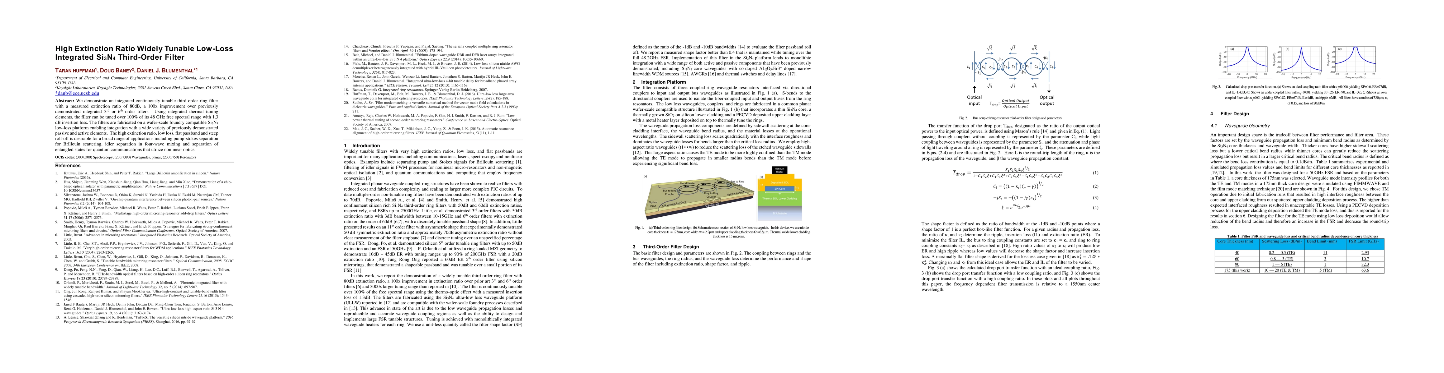 This paper presents a highly tunable third-order ring filter made of Si3N4 with an 80dB extinction ratio, a significant improvement over previous filters, and demonstrates its tunability over 100% of its 48 GHz free spectral range with minimal insertion loss. The filter's properties make it suitable for applications in Brillouin scattering, four-wave mixing, and quantum communications.