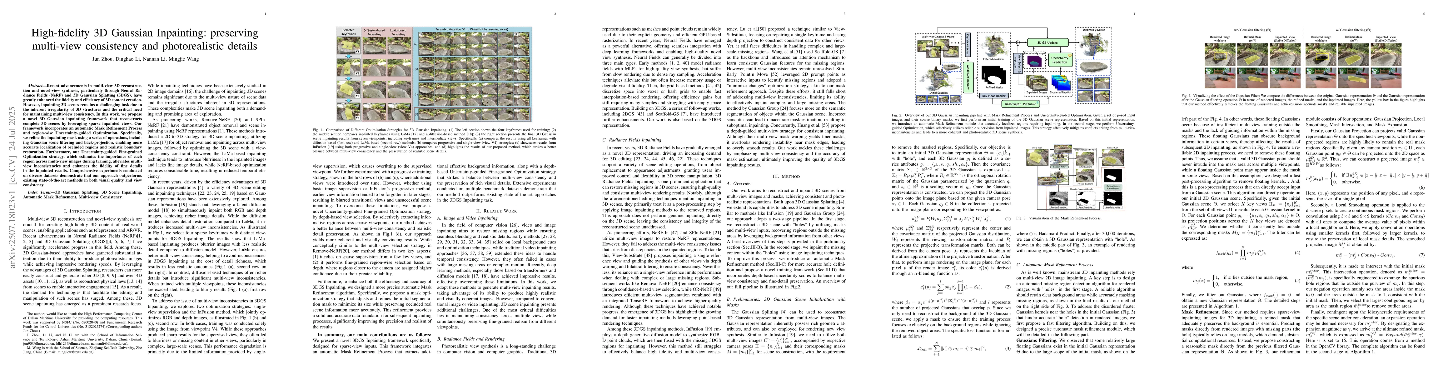 This work introduces a novel 3D Gaussian inpainting framework that combines automatic mask refinement with uncertainty-guided optimization, distinguishing itself from existing methods that either lack multi-view consistency or struggle with fine-grained detail preservation.