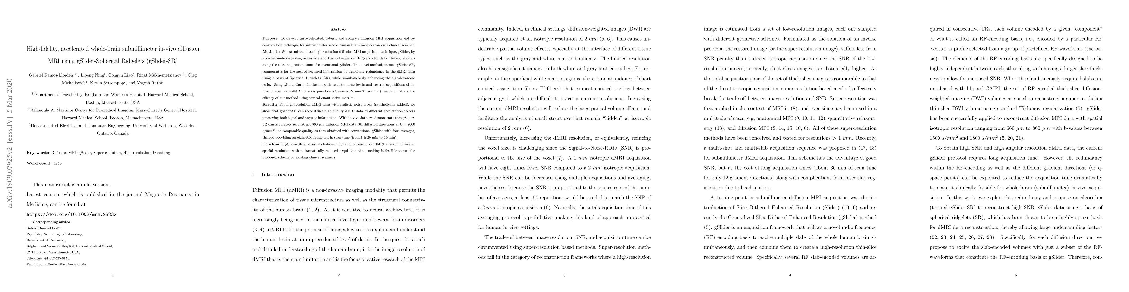 This paper introduces gSlider-SR, an accelerated diffusion MRI technique that significantly reduces scan time while maintaining high-fidelity submillimeter resolution for whole-brain in-vivo scans. The method leverages spherical ridgelets to reconstruct data from under-sampled q-space, achieving an eight-fold reduction in time from 1 hour 20 minutes to 10 minutes.