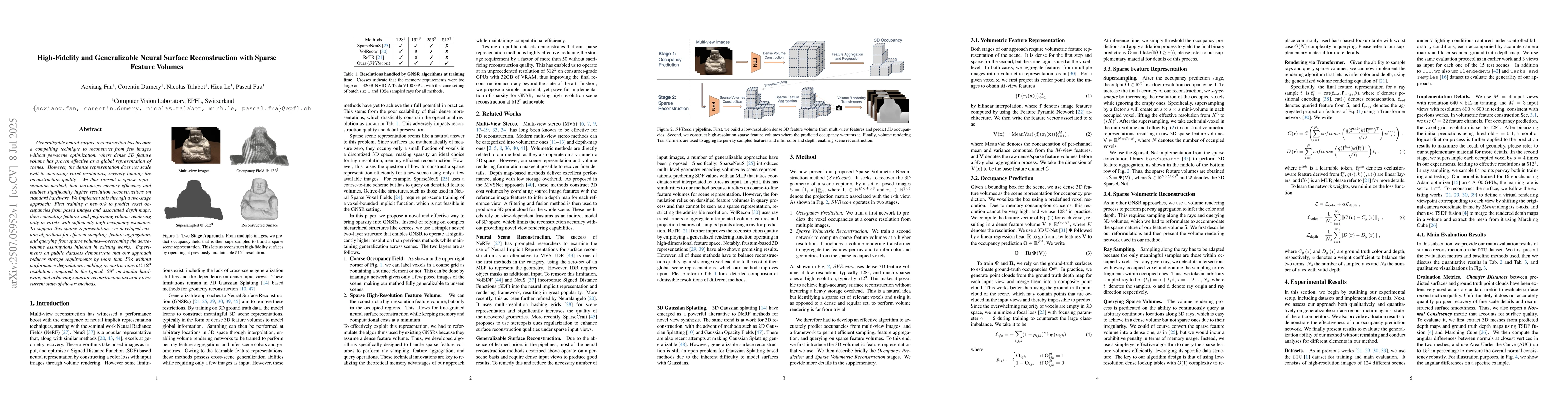 Generalizable neural surface reconstruction has become a compelling technique to reconstruct from few images without per-scene optimization, where dense 3D feature volume has proven effective as a global representation of scenes. However, the dense representation does not scale well to increasing voxel resolutions, severely limiting the reconstruction quality. We thus present a sparse representation method, that maximizes memory efficiency and enables significantly higher resolution reconstructions on standard hardware. We implement this through a two-stage approach: First training a network to predict voxel occupancies from posed images and associated depth maps, then computing features and performing volume rendering only in voxels with sufficiently high occupancy estimates. To support this sparse representation, we developed custom algorithms for efficient sampling, feature aggregation, and querying from sparse volumes-overcoming the dense-volume assumptions inherent in existing works. Experiments on public datasets demonstrate that our approach reduces storage requirements by more than 50 times without performance degradation, enabling reconstructions at $512^3$ resolution compared to the typical $128^3$ on similar hardware, and achieving superior reconstruction accuracy over current state-of-the-art methods.