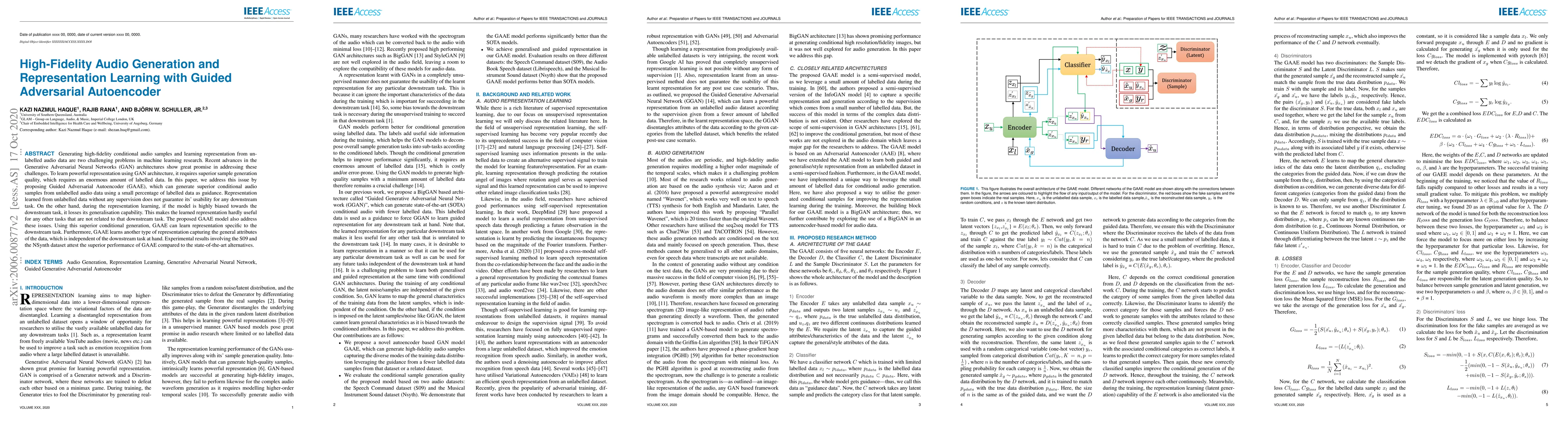 The paper proposes a Guided Adversarial Autoencoder (GAAE) to achieve high-fidelity audio generation and disentangled representation learning from unlabelled data, while leveraging a small percentage of labelled samples to maintain generalizability for future tasks. The model generates superior quality audio and demonstrates effective representation learning.