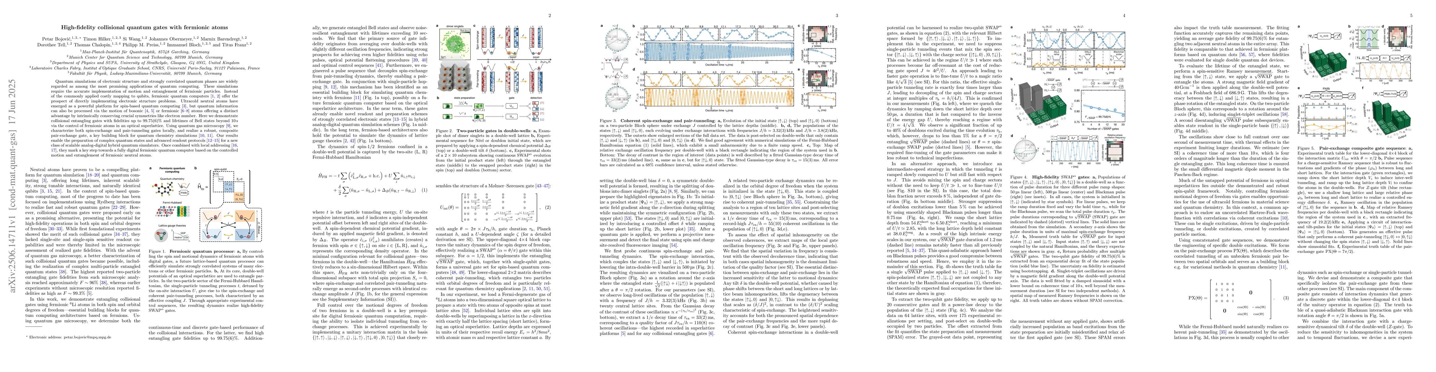 Quantum simulations of electronic structure and strongly correlated quantum phases are widely regarded as among the most promising applications of quantum computing. These simulations require the accurate implementation of motion and entanglement of fermionic particles. Instead of the commonly applied costly mapping to qubits, fermionic quantum computers offer the prospect of directly implementing electronic structure problems. Ultracold neutral atoms have emerged as a powerful platform for spin-based quantum computing, but quantum information can also be processed via the motion of bosonic or fermionic atoms offering a distinct advantage by intrinsically conserving crucial symmetries like electron number. Here we demonstrate collisional entangling gates with fidelities up to 99.75(6)% and lifetimes of Bell states beyond $10\,s$ via the control of fermionic atoms in an optical superlattice. Using quantum gas microscopy, we characterize both spin-exchange and pair-tunneling gates locally, and realize a robust, composite pair-exchange gate, a key building block for quantum chemistry simulations. Our results enable the preparation of complex quantum states and advanced readout protocols for a new class of scalable analog-digital hybrid quantum simulators. Once combined with local addressing, they mark a key step towards a fully digital fermionic quantum computer based on the controlled motion and entanglement of fermionic neutral atoms.