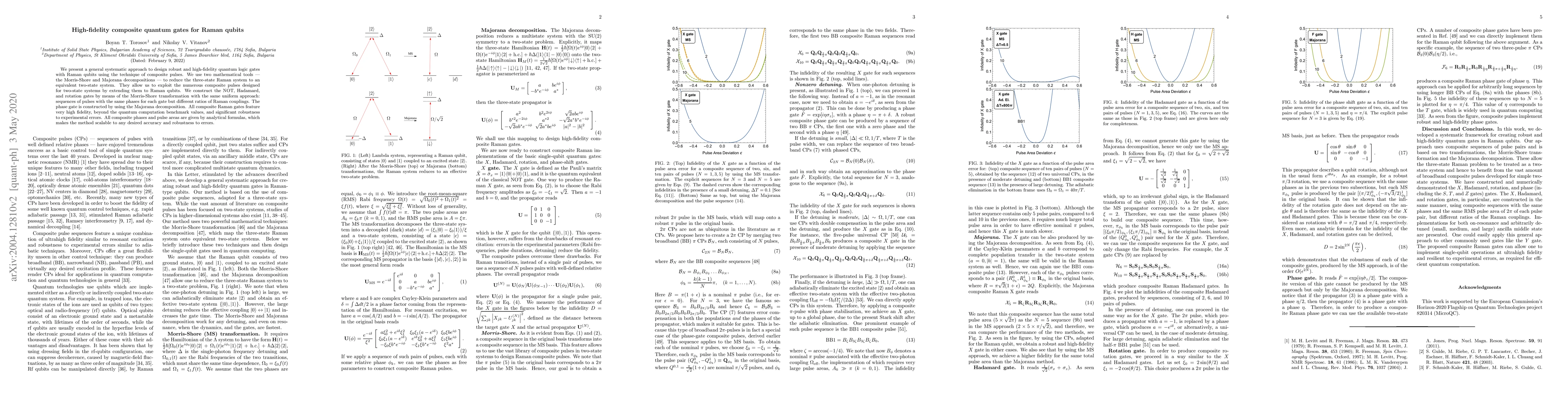 This paper introduces a systematic method to design high-fidelity quantum logic gates for Raman qubits using composite pulses, leveraging Morris-Shore and Majorana decompositions to convert a three-state system into an equivalent two-state system. The method achieves robust NOT, Hadamard, and rotation gates, as well as a phase gate, with high fidelity and error resistance.