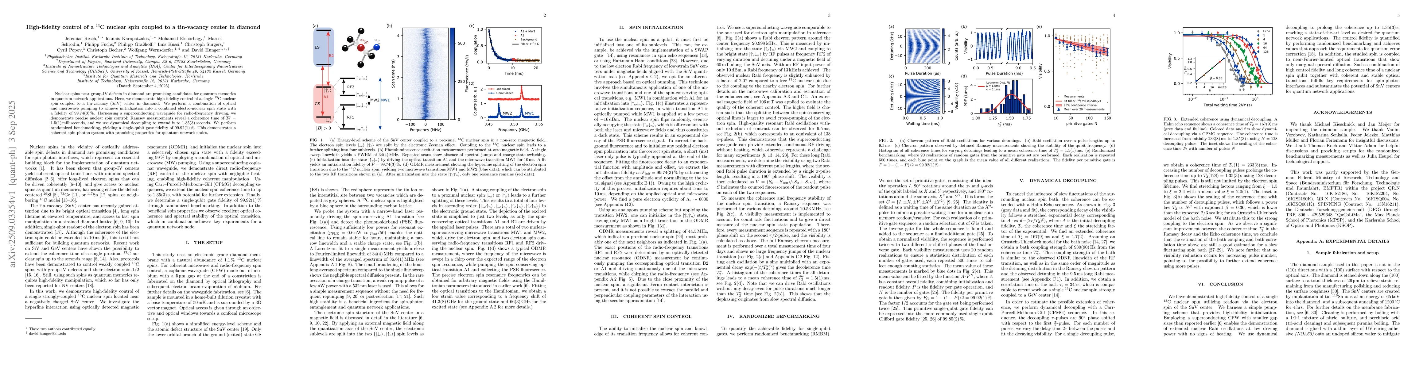 Nuclear spins near group-IV defects in diamond are promising candidates for quantum memories in quantum network applications. Here, we demonstrate high-fidelity control of a single $^{13}$C nuclear spin coupled to a tin-vacancy (SnV) center in diamond. We perform a combination of optical and microwave pumping to achieve initialization into a combined electro-nuclear spin state with a fidelity of $99.74(3)\,\%$. Harnessing a superconducting waveguide for radio-frequency driving, we demonstrate precise nuclear spin control: Ramsey measurements reveal a coherence time of $T_2^* = 1.5(1)\,$milliseconds, and we use dynamical decoupling to extend it to $1.35(3)\,$seconds. We perform randomized benchmarking, yielding a single-qubit gate fidelity of $99.92(1)\,\%$. This demonstrates a coherent spin-photon system with promising properties for quantum network nodes.