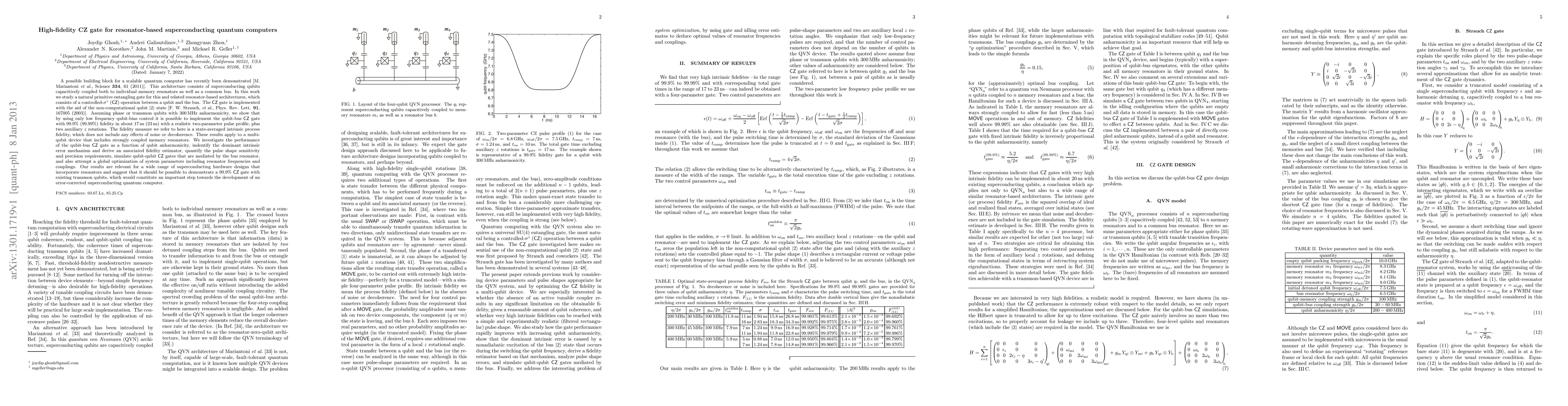 A possible building block for a scalable quantum computer has recently been demonstrated [M. Mariantoni et al., Science 334, 61 (2011)]. This architecture consists of superconducting qubits capacitively coupled both to individual memory resonators as well as a common bus. In this work we study a natural primitive entangling gate for this and related resonator-based architectures, which consists of a CZ operation between a qubit and the bus. The CZ gate is implemented with the aid of the non-computational qubit |2> state [F. W. Strauch et al., Phys. Rev. Lett. 91, 167005 (2003)]. Assuming phase or transmon qubits with 300 MHz anharmonicity, we show that by using only low frequency qubit-bias control it is possible to implement the qubit-bus CZ gate with 99.9% (99.99%) fidelity in about 17ns (23ns) with a realistic two-parameter pulse profile, plus two auxiliary z rotations. The fidelity measure we refer to here is a state-averaged intrinsic process fidelity, which does not include any effects of noise or decoherence. These results apply to a multi-qubit device that includes strongly coupled memory resonators. We investigate the performance of the qubit-bus CZ gate as a function of qubit anharmonicity, indentify the dominant intrinsic error mechanism and derive an associated fidelity estimator, quantify the pulse shape sensitivity and precision requirements, simulate qubit-qubit CZ gates that are mediated by the bus resonator, and also attempt a global optimization of system parameters including resonator frequencies and couplings. Our results are relevant for a wide range of superconducting hardware designs that incorporate resonators and suggest that it should be possible to demonstrate a 99.9% CZ gate with existing transmon qubits, which would constitute an important step towards the development of an error-corrected superconducting quantum computer.