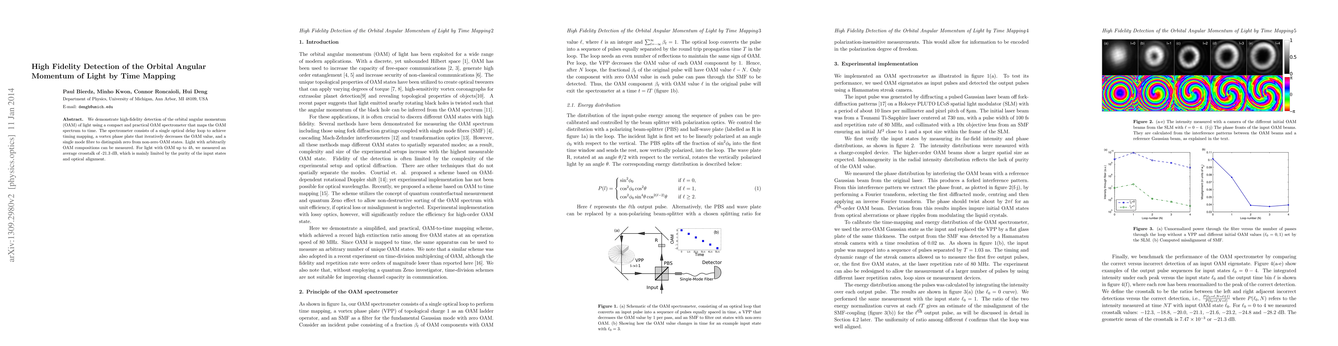 This paper presents a compact OAM spectrometer that uses time mapping to detect the orbital angular momentum of light with high fidelity, achieving an average crosstalk of -21.3 dB for OAM up to 4hbar, with performance mainly limited by input state purity and optical alignment.